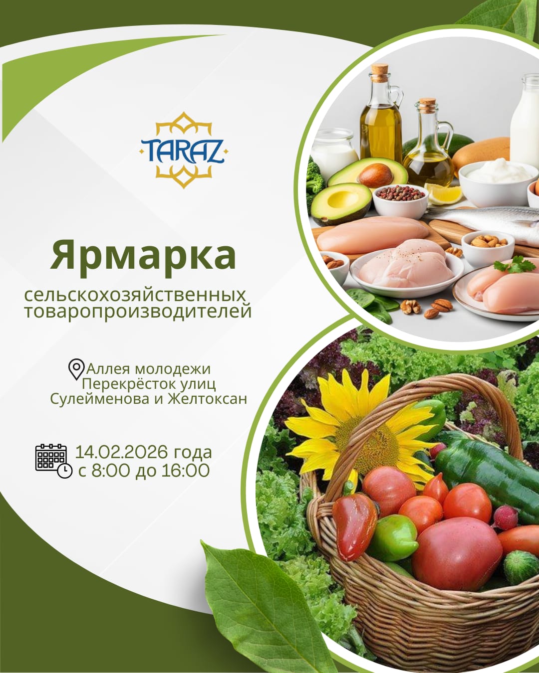 14 февраля в городе Тараз, на Аллее молодежи (перекрёсток улиц Сулейменова – Желтоксан) состоится ярмарка сельскохозяйственной продукции.