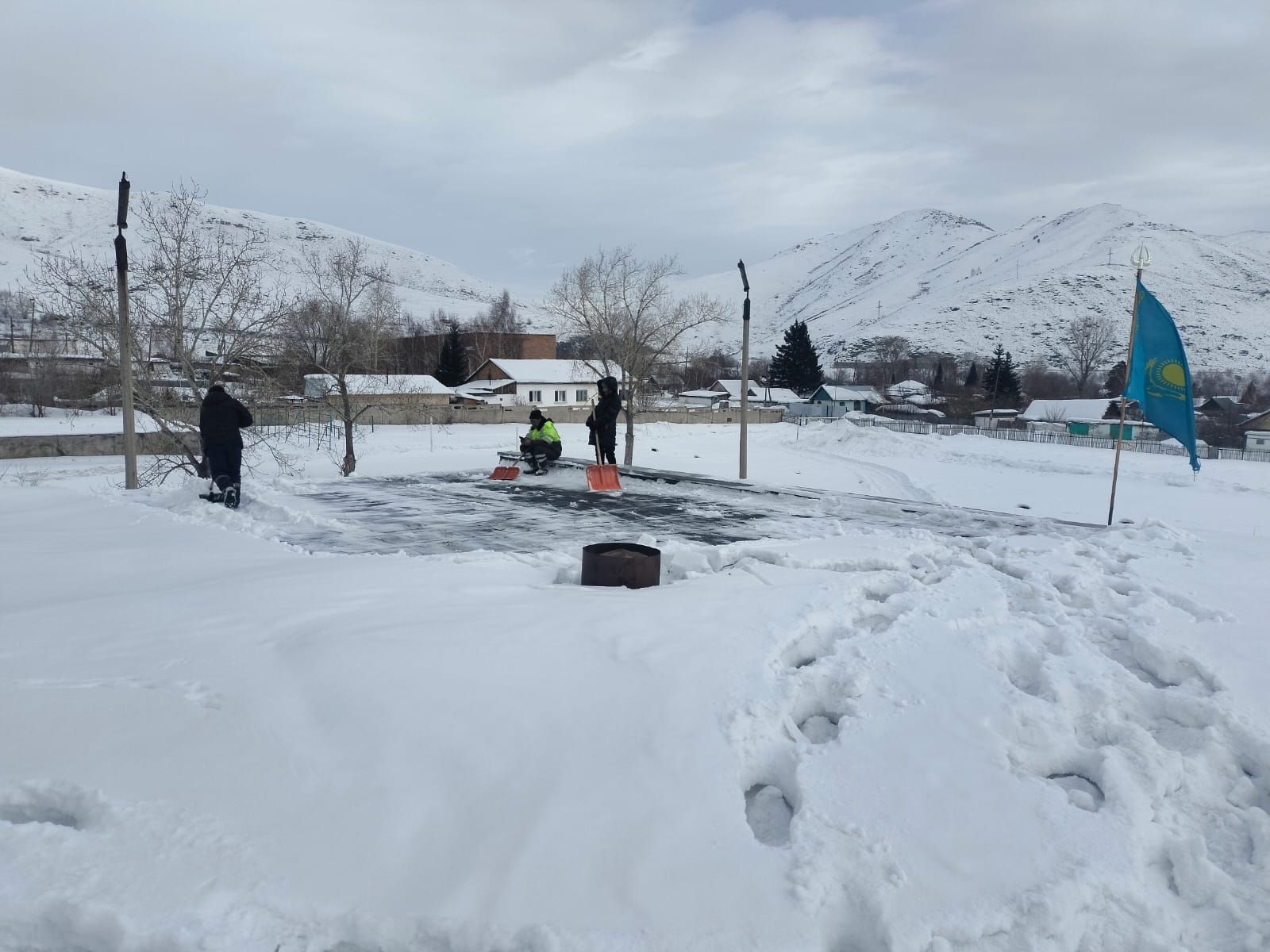 Аким посёлка Октябрьский совместно с общественными работниками провёл работы по очистке крыши здания акимата от снега и наледи.