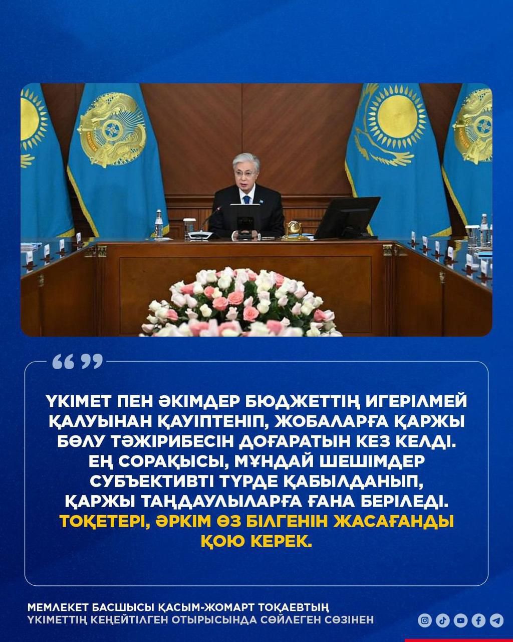 Мемлекет басшысы: мемлекеттік басқару тиімділігін арттыру, бюджет қаражатын ұтымды пайдалану, инфляцияны тұрақтандыру, инвестициялық жобаларды жүзеге асыру және мемлекеттік жүйелерді үйлестіру қажеттігін атап өтті.