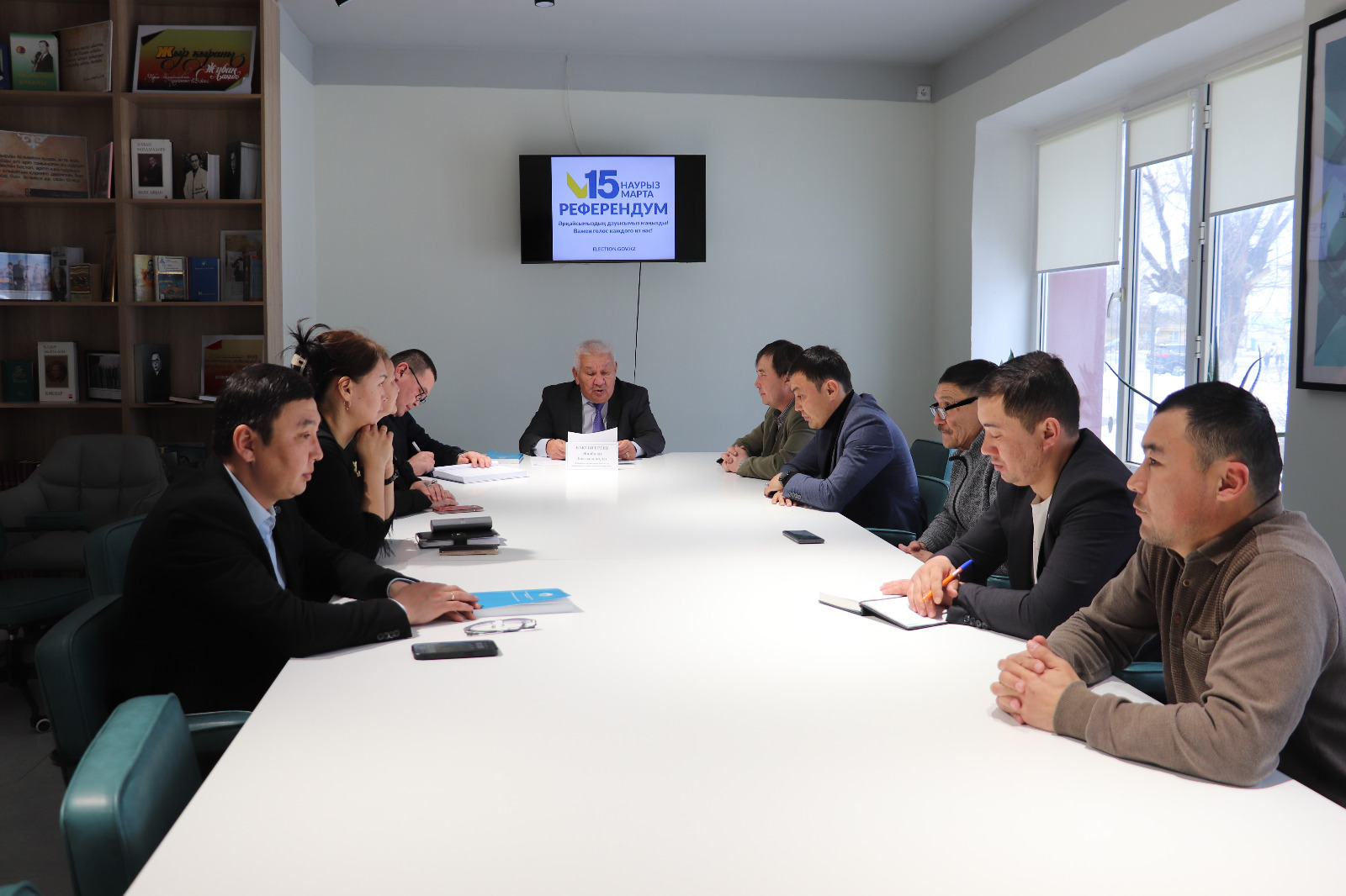 Сегодня председатель районной территориальной комиссии референдума Жанболат Бактыгереев провёл рабочее совещание, посвящённое уточнению хода подготовки к референдуму, который состоится 15 марта.