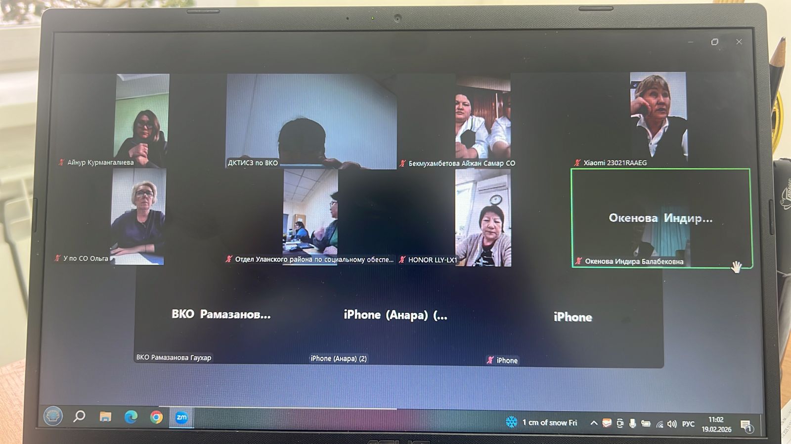 19 февраля 2026 года в онлайн формате посредством Zoom Департаментом Комитета регулирования и контроля в сфере социальной защиты населения Министерства труда и социальной защиты населения Республики Казахстан по Восточно-Казахстанской области по согласованному графику обучения проведен семинар-обучение на тему «Улучшение качества приема документов на назначение пенсионных и социальных выплат» с сотрудниками филиала НАО «Государственная корпорация «Правительство для граждан» по Восточно-Казахстанской области и отделения по району Самар, Курчумскому и Уланскому районам.