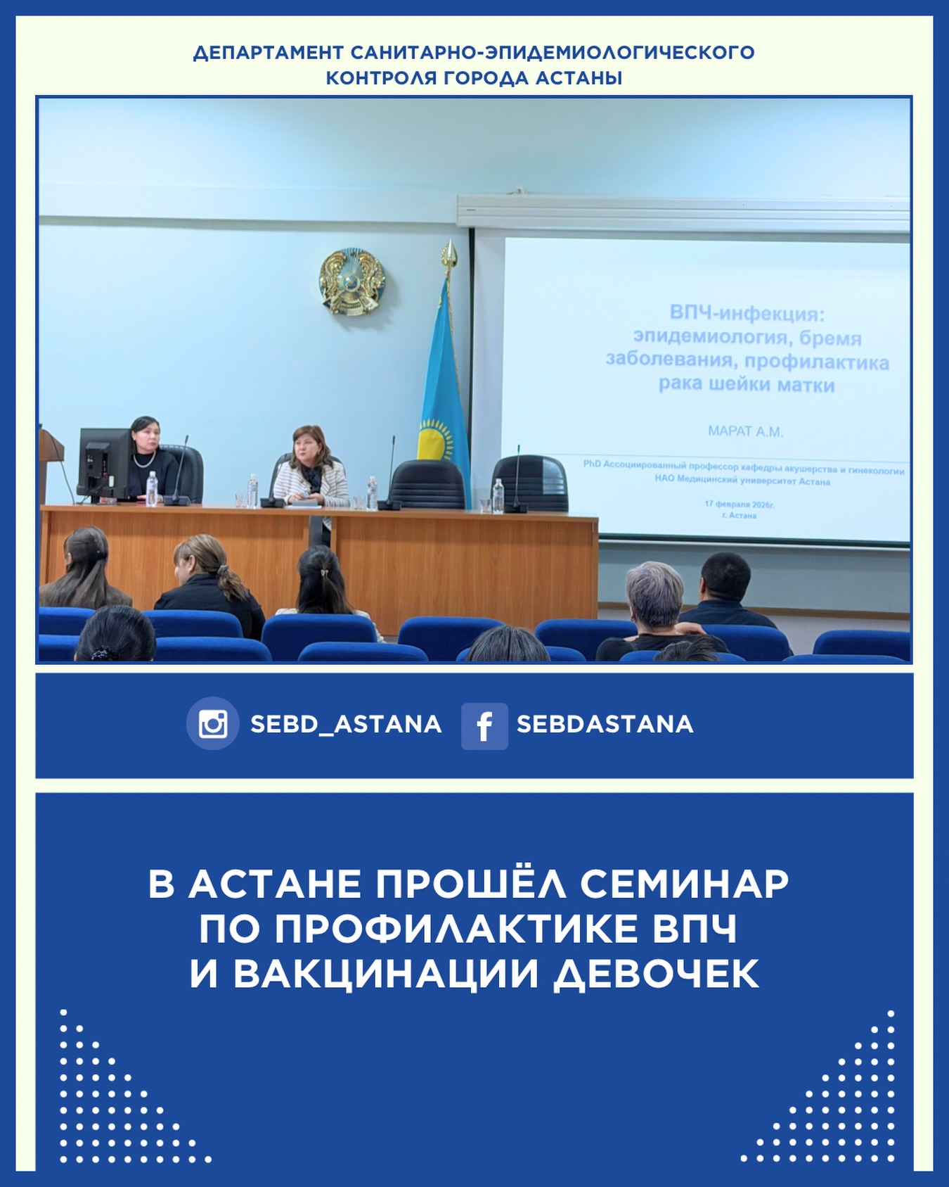17 февраля 2026 года Департамент санитарно-эпидемиологического контроля города Астаны проведен семинар для медицинских работников ПМСП и общеобразовательных школ, занимающихся вопросами иммунизации, независимо от формы собственности школ. С докладом «ВПЧ инфекция. Роль вакцинации в профилактике рака шейки матки» выступила доктор Айзада Маратқызы.