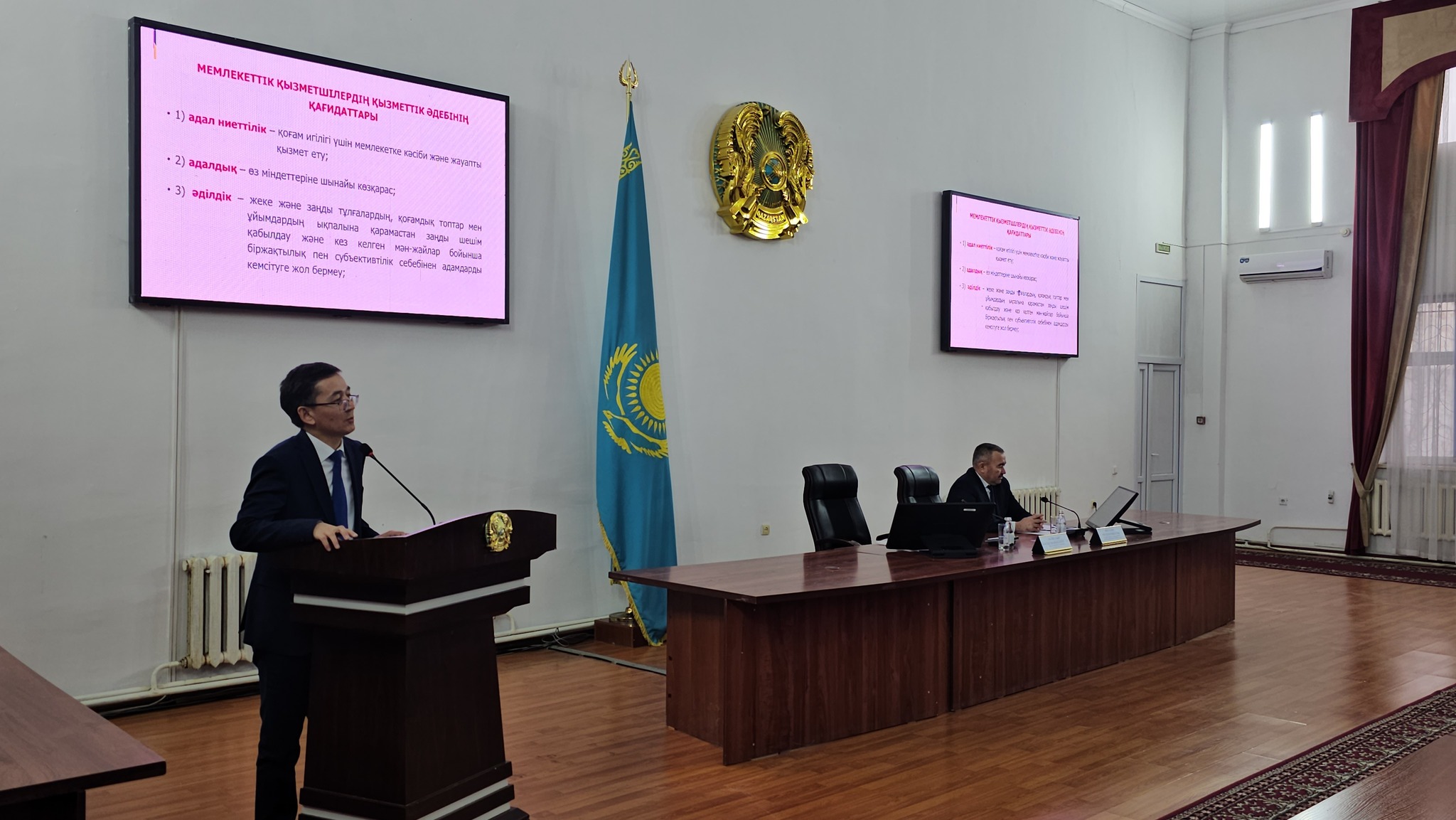 Омбудсмен по этике Багдат Абдикадыр ознакомил государственных служащих с законодательством Республики Казахстан о государственной службе и борьбе с коррупцией, а также с нормами Кодекса этики, и разъяснил права и социальные гарантии государственных служащих. Он также отметил, что выполнение обязанностей на государственной службе является особым доверием со стороны общества и государства, предъявляющим высокие требования к морали, этике и нравственному облику государственных служащих.