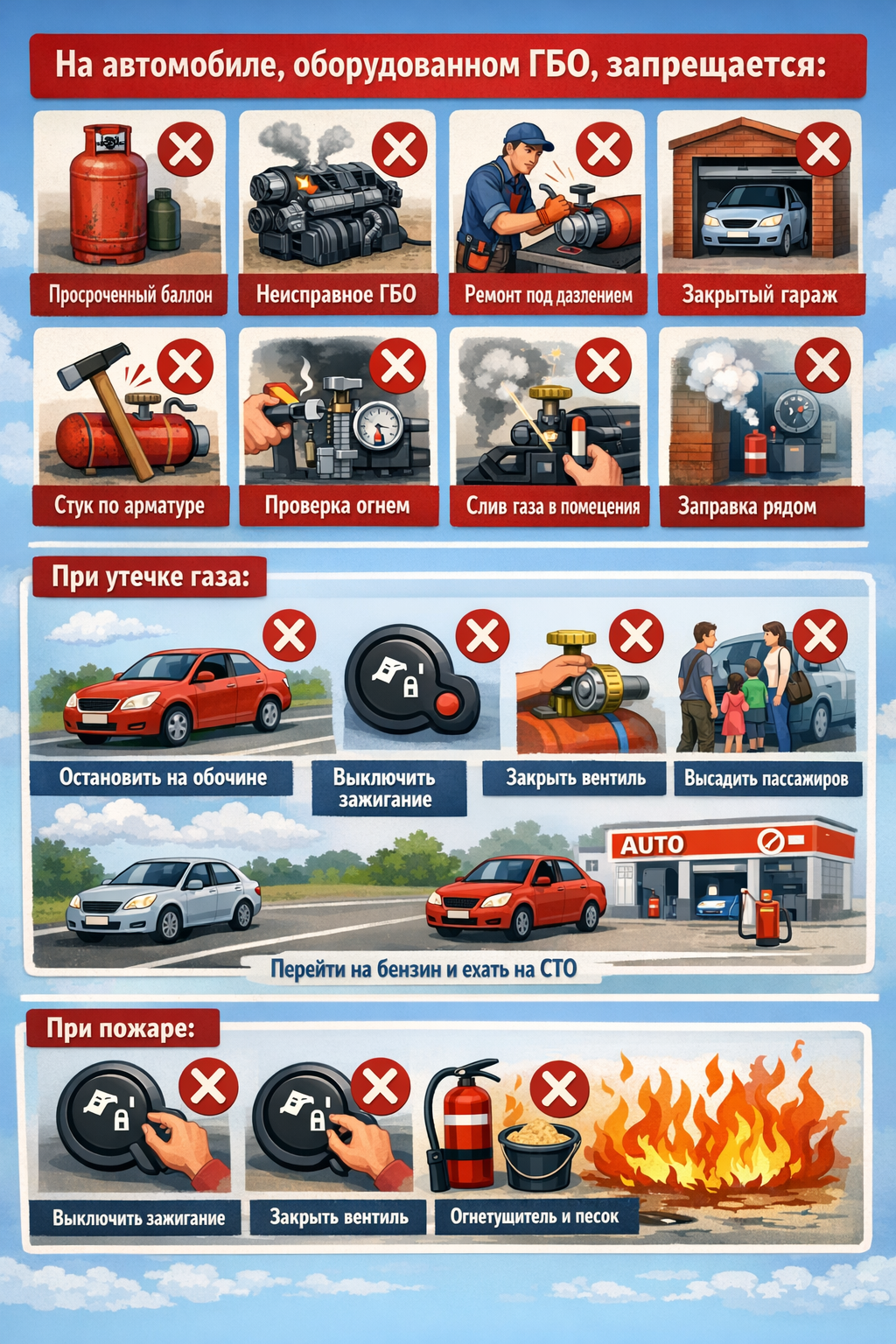– ставить автомобиль с неисправным ГБО в закрытое помещение;