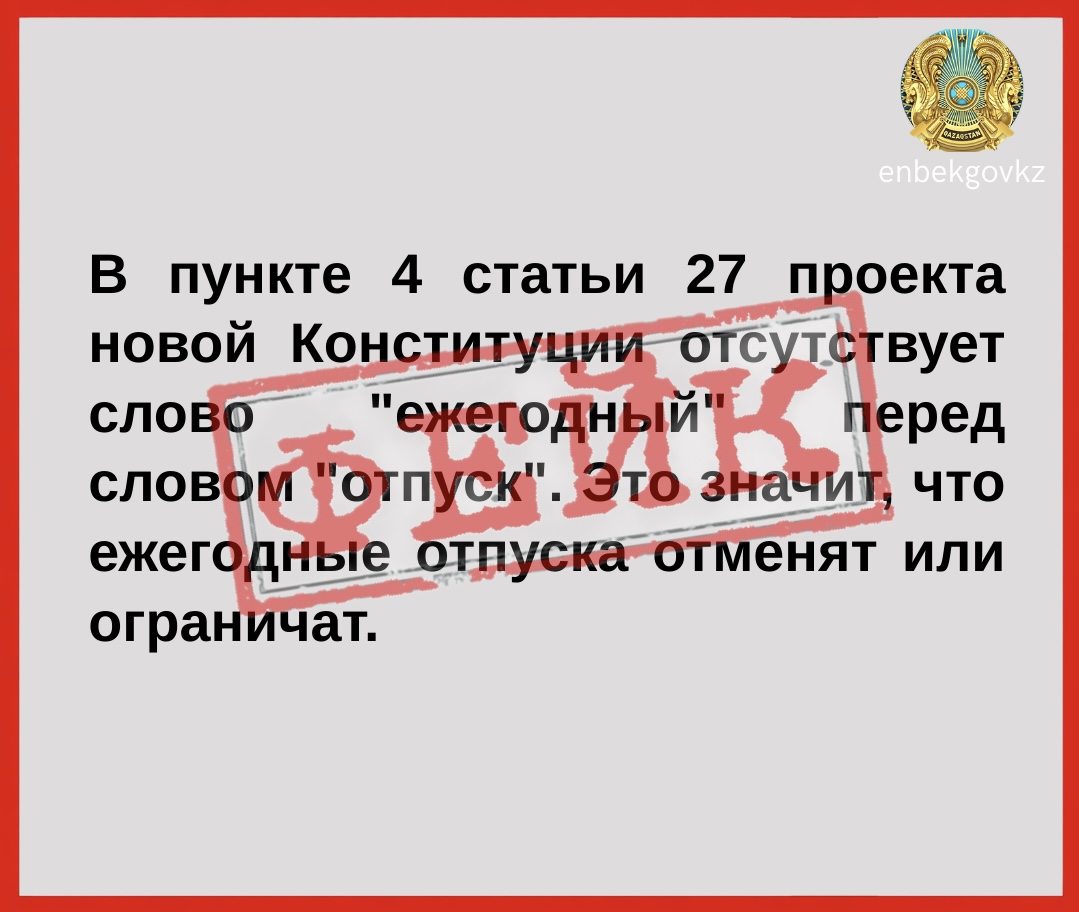 В информационном пространстве распространяются утверждения о том, что отсутствие слова «ежегодный» перед словом «отпуск» в пункте 4 статьи 27 проекта новой Конституции якобы может привести к ограничению прав работников.