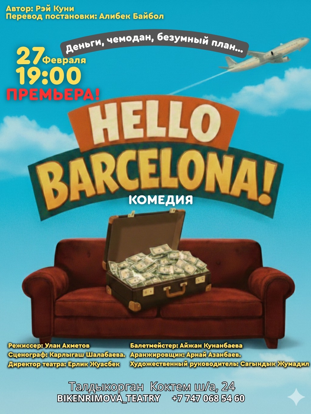Уважаемые жители области Жетісу и гости города, приглашаем вас 27 февраля в 19:00 в Академический драматический театр имени Бикен Римовой на просмотр комедии Рэя Куни «Hello, Барселона!»