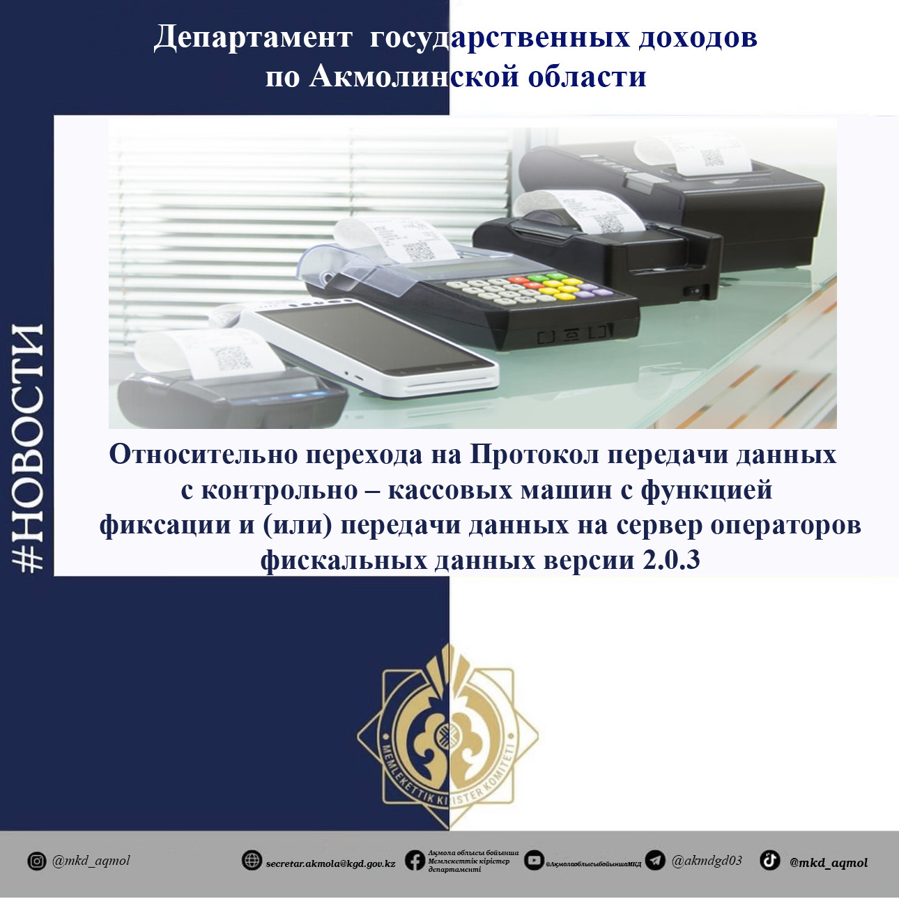 Департамент государственных доходов по Акмолинской области сообщает, что в соответствии с внесенными изменениями в приказ Министра финансов РК №208 от 16 февраля 2018 года, с 20 июня 2025 года введен в действие Протокол передачи данных версии 2.0.3.