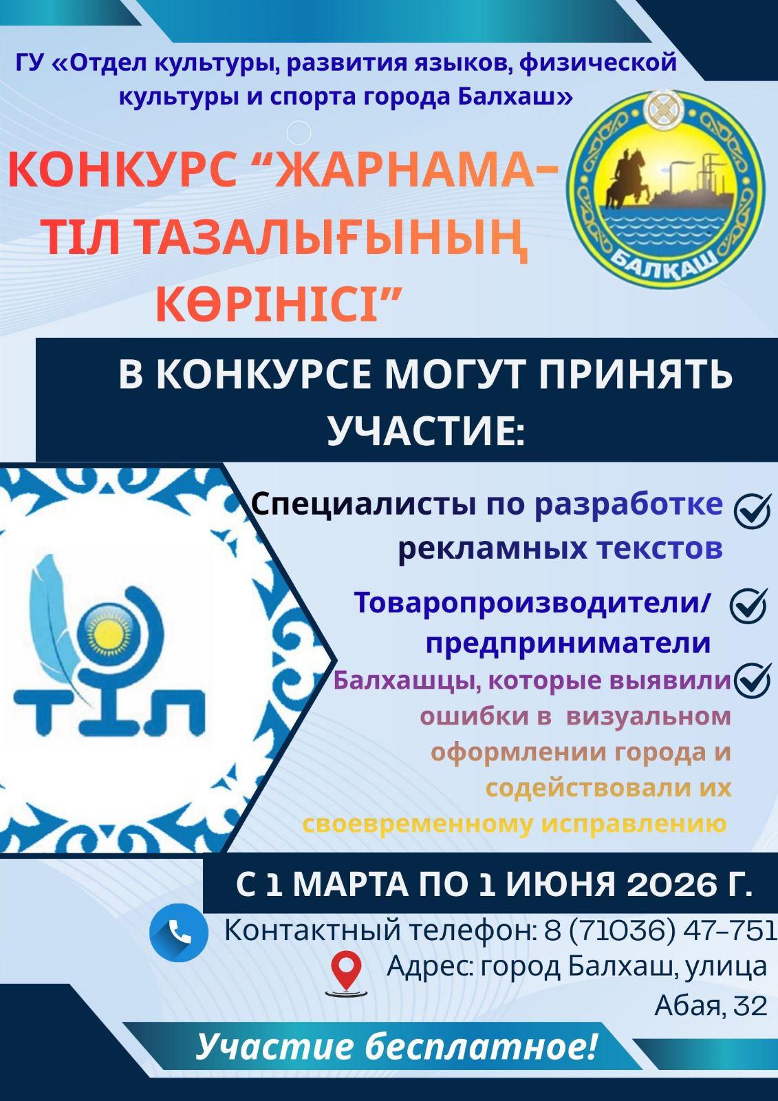 С 1 апреля по 1 июня 2026 года состоится городской конкурс. В конкурсе могут принять участие предприниматели города и товаропроизводители, балхашцы, которые выявили ошибки в визуальном оформлении города и содействовали их своевременному исправлению и специалисты по разработке рекламных текстов.