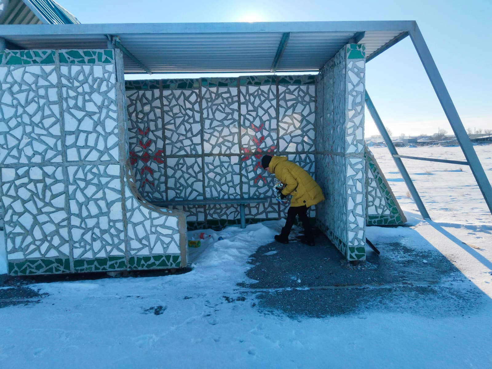 Проведены работы по уборке мусора на автобусной остановке.