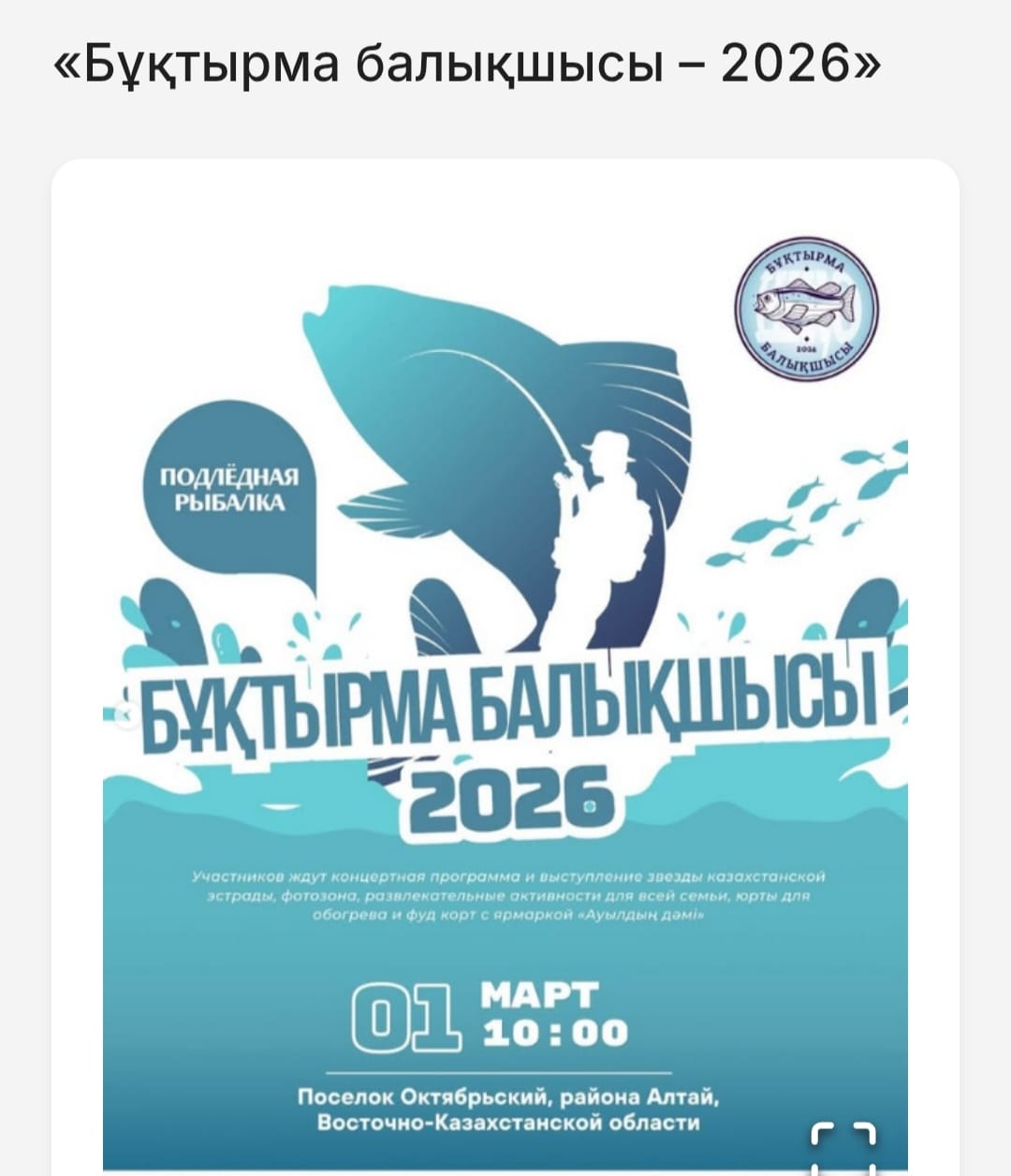 1 марта 2026 года в поселке Октябрьский района Алтай Восточно-Казахстанской области состоится Второй республиканский фестиваль подлёдной рыбалки «Бұқтырма балықшысы – 2026»!
