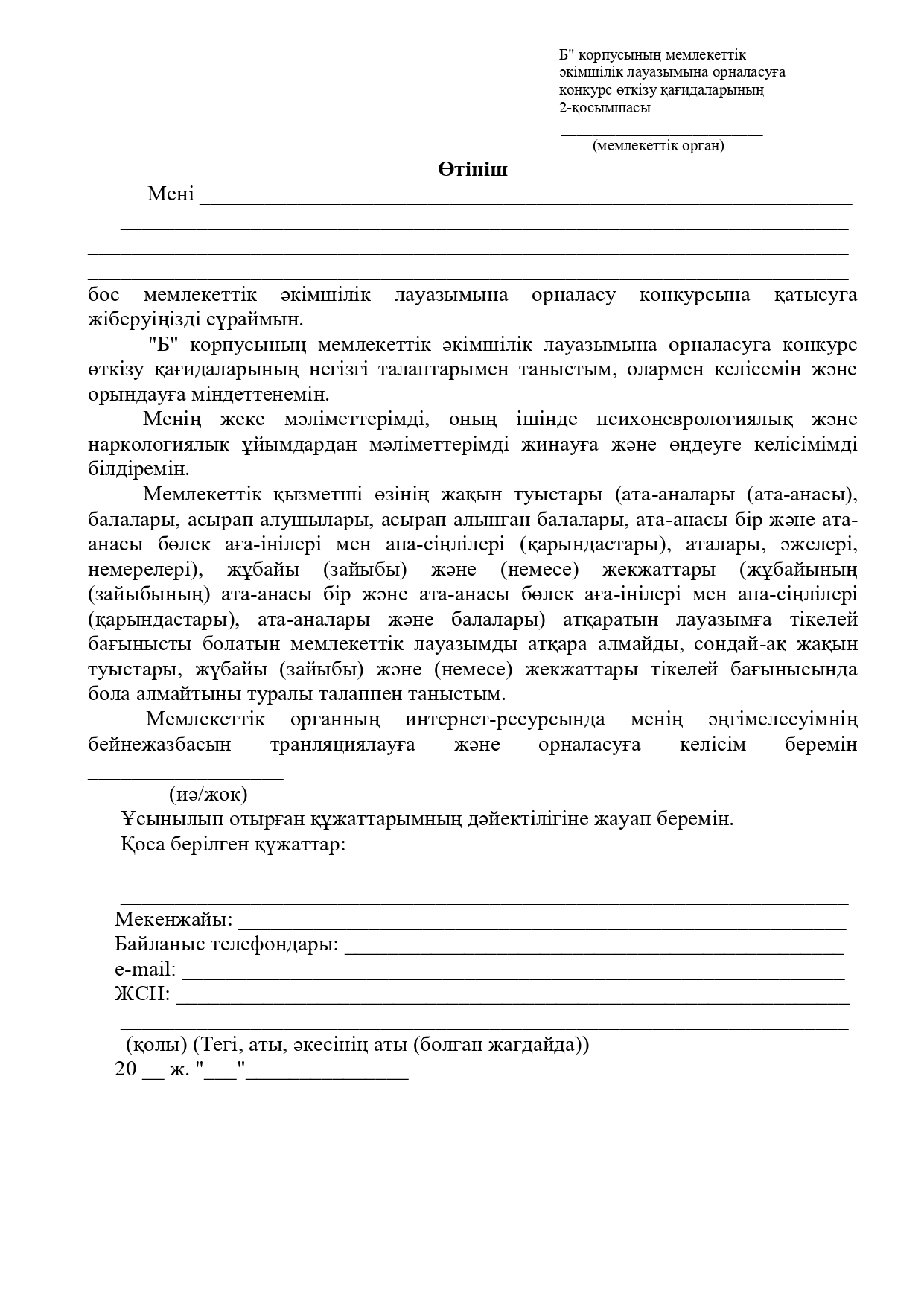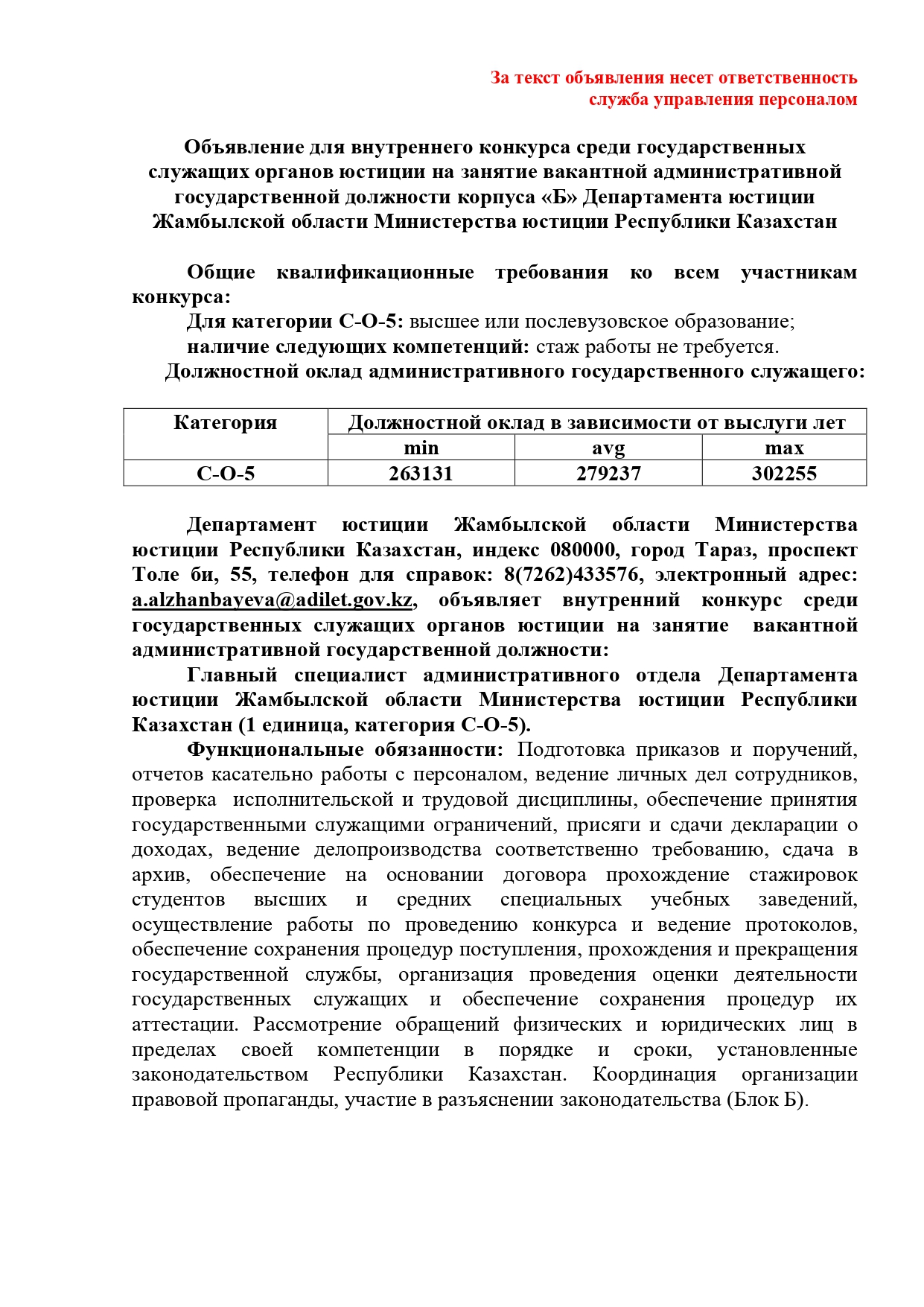 Объявление для внутреннего конкурса среди государственных служащих органов юстиции на занятие вакантной административной государственной должности корпуса «Б» Департамента юстиции Жамбылской области