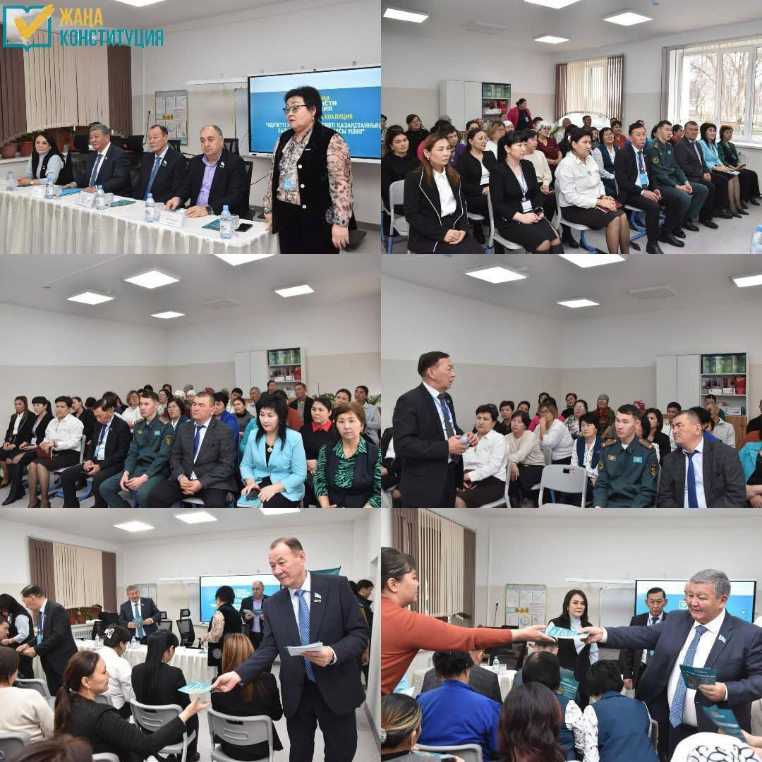 Члены Жамбылской областной общенациональной коалиции «За Народную Конституцию справедливого и прогрессивного Казахстана!» А.Нуралиев, Ф.Жунусова, Ж.Аббосов, А.Райкулов провели встречу с педагогическим коллективом Диханской опорной школы, расположенной в селе Дихан.