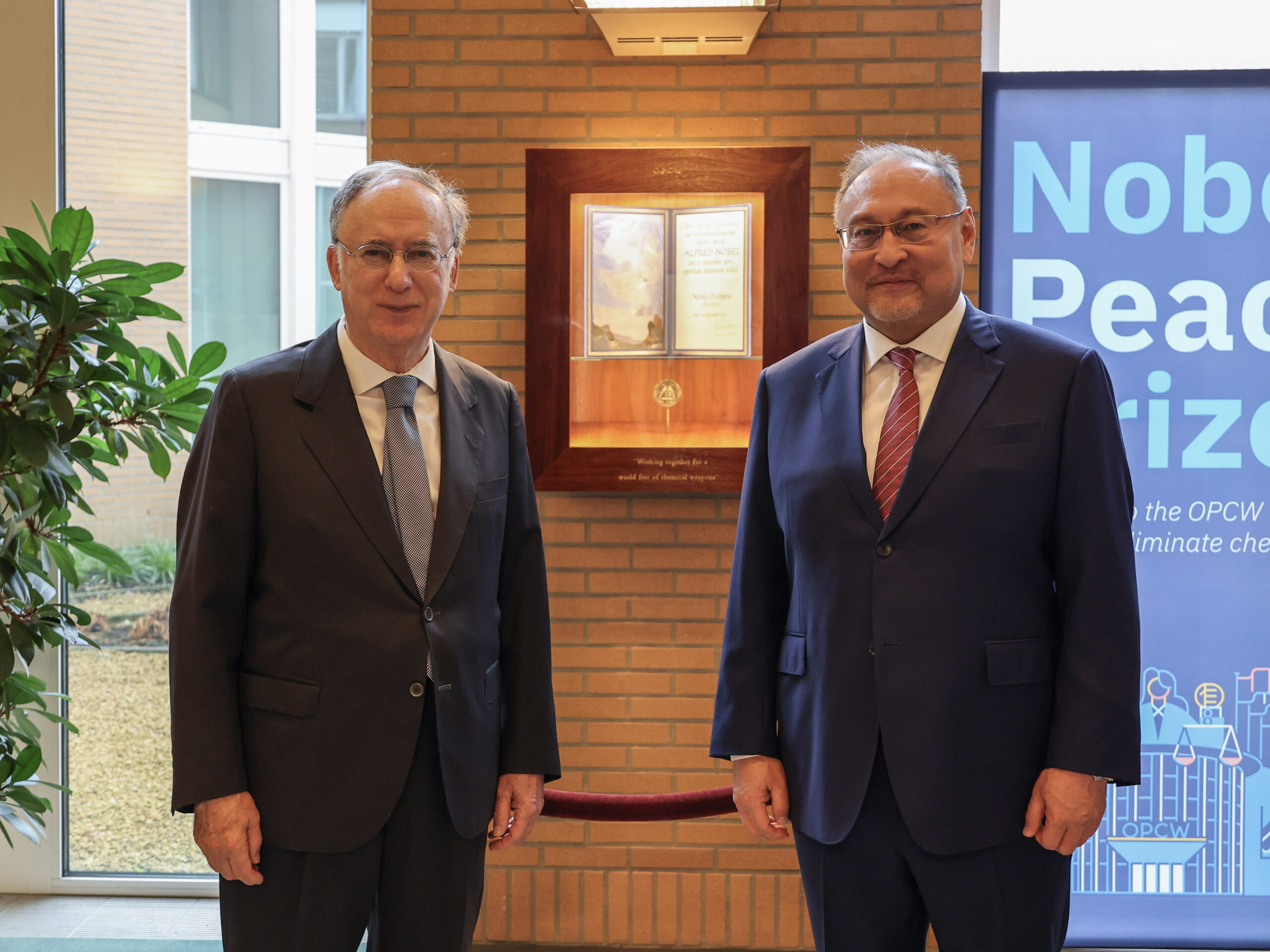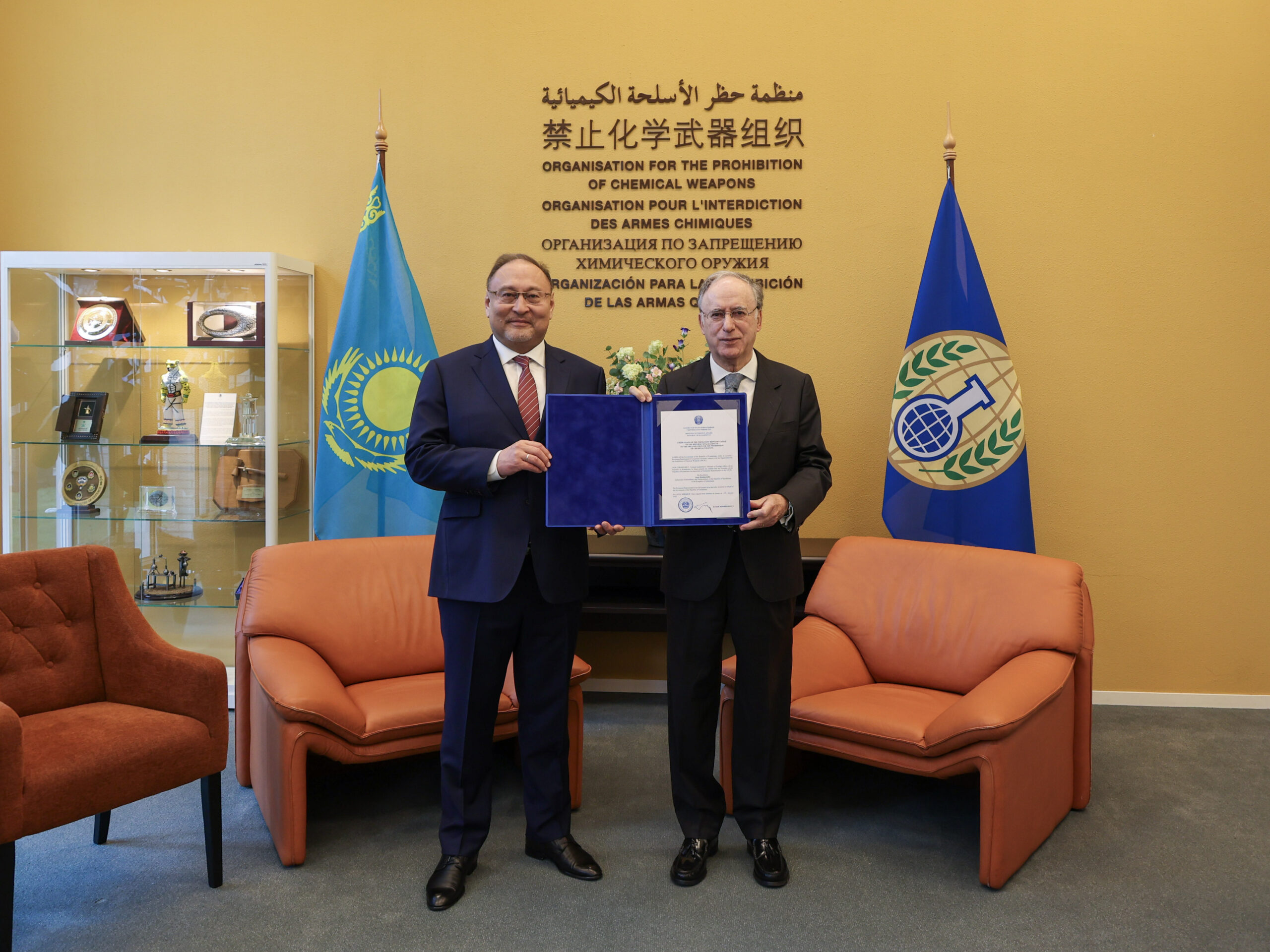 Гаага, 24 февраля 2026 г. – В штаб-квартире Организации по запрещению химического оружия (ОЗХО) в Гааге Посол Республики Казахстан в Нидерландах, Постоянный представитель Казахстана при ОЗХО Акан Рахметуллин вручил верительные грамоты Генеральному директору ОЗХО Фернандо Ариасу.