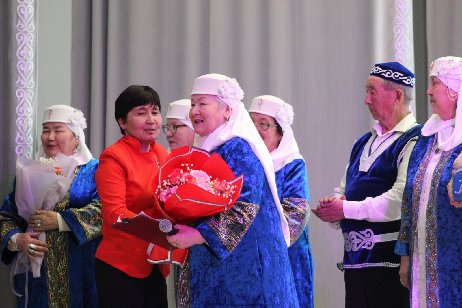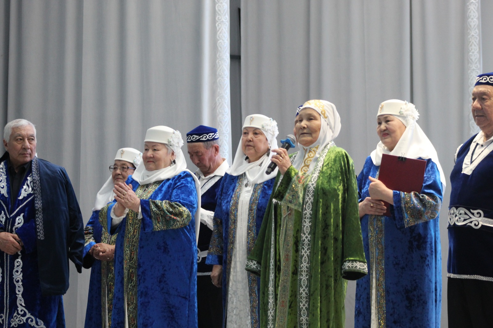 Гостям от имени районного акимата в соответствии с традицией были оказаны почести – руководителям ансамблей на плечи накинули чапаны.