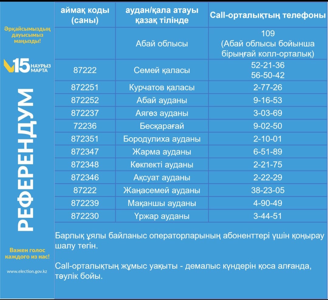 ПРИМЕЧАНИЕ: По области Абай запущен Call-центр с единым номером «109», по которому можно проверить свой адрес и номер избирательного участка для голосования на Референдуме.