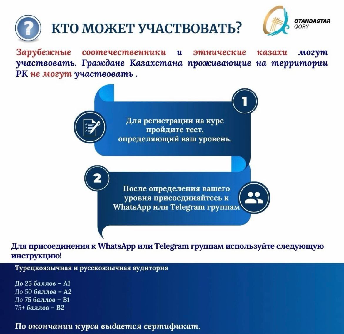 🌍 НАО «Фонд Отандастар» продолжает популяризировать казахский язык за рубежом и с марта 2026 года запускает новый поток бесплатных онлайн-курсов!