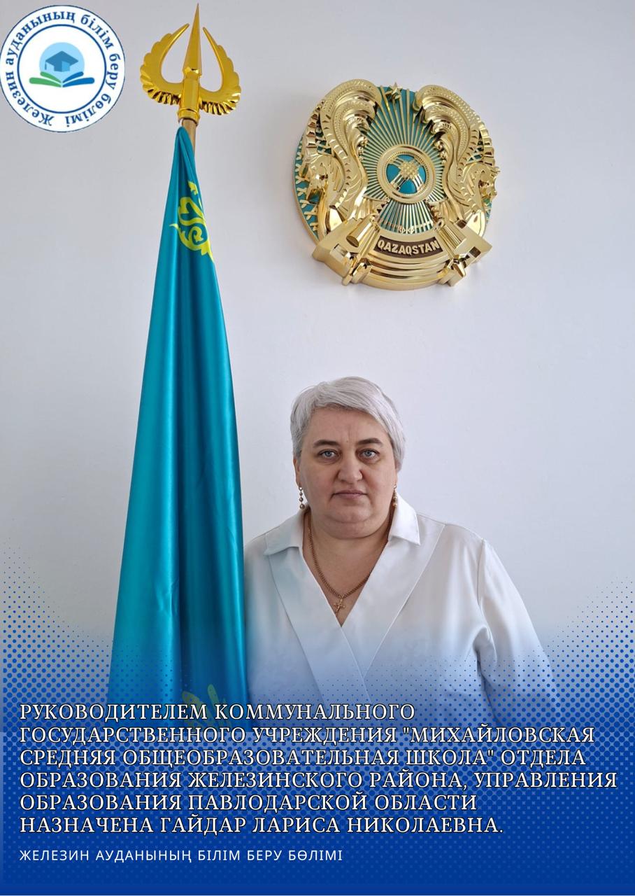 По итогам конкурсных процедур, руководителем коммунального государственного учреждения «Михайловская средняя общеобразовательная школа» отдела образования Железинского района, управления образования Павлодарской области назначена Гайдар Лариса Николаевна.