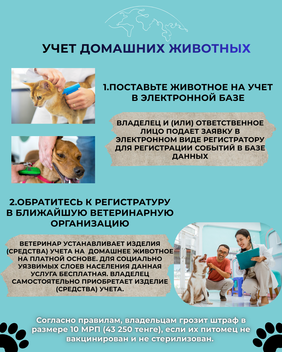 В соответствии с Законом Республики Казахстан «Об ответственном обращении с животными» и Правилами учета домашних животных, учет домашних животных является обязательным.