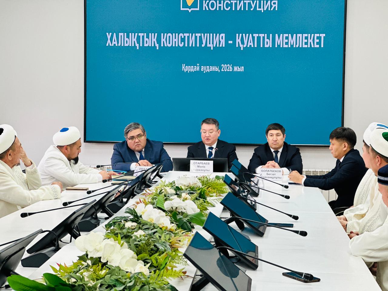 Мероприятие продолжилось в конференц-зале государственного архива Кордайского района. Здесь советник Президента Республики Казахстан встретился с имамами мечетей и обменялся мнениями о значении референдума. Первую речь произнес главный имам Кордейского района Азамат Берикулы. В своем слове главный имам подчеркнул важность единства и стабильности страны, а также особое место духовных ценностей в поддержании мира в обществе.