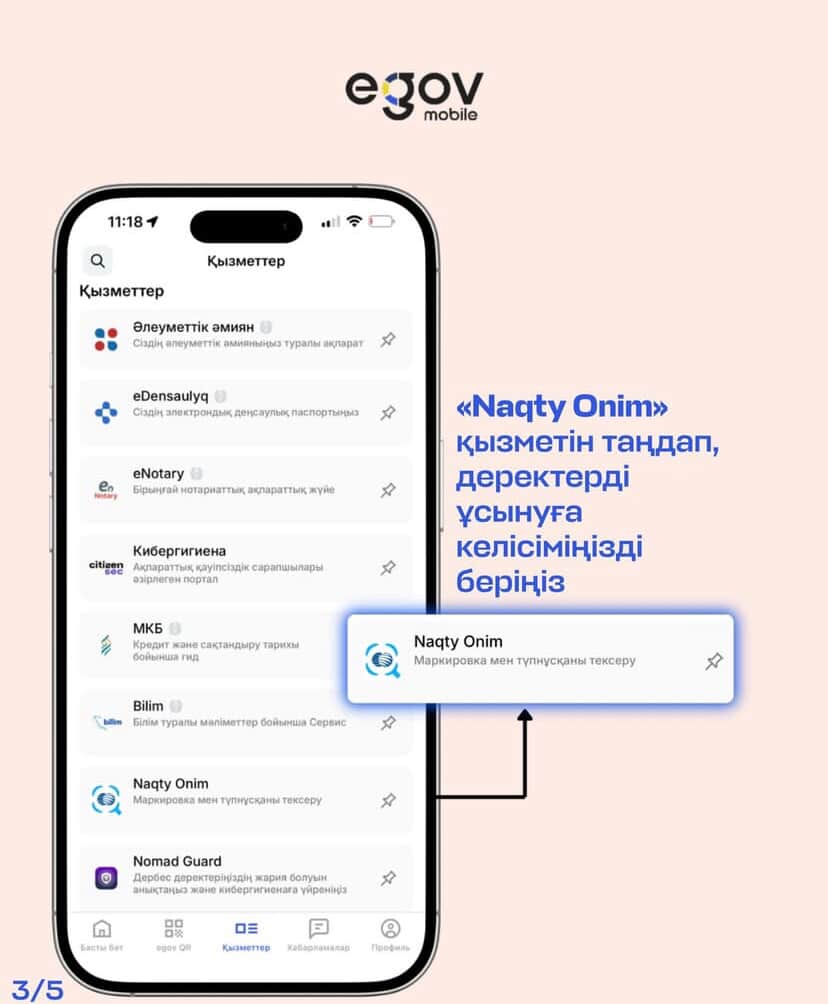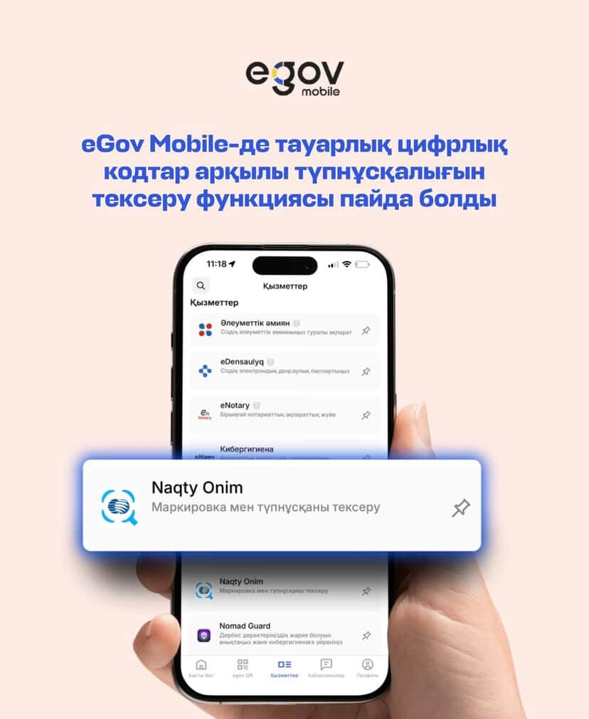 В мобильном приложении eGov Mobile стала доступна функция проверки подлинности товаров по цифровым кодам. Новый функционал реализован на базе сервиса Naqty Onim и обеспечивает пользователям быстрый и бесплатный доступ к сведениям из системы цифровой маркировки.