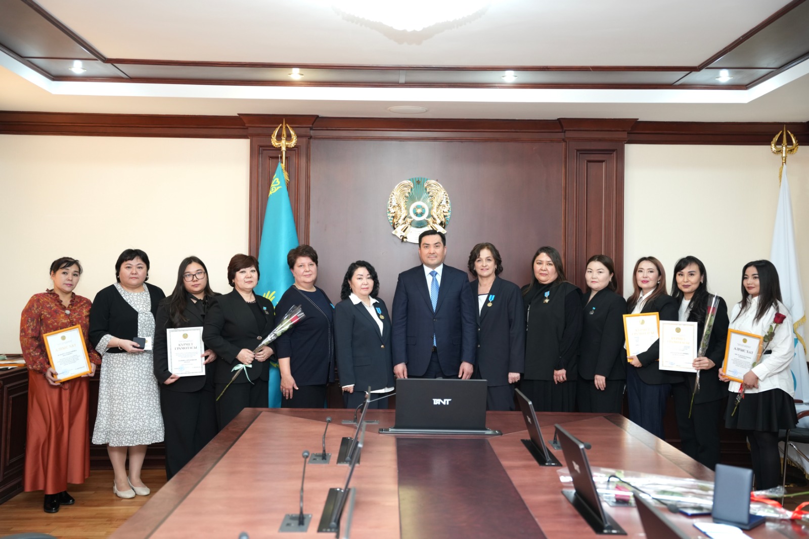 Кульминацией встречи стала церемония награждения. В соответствии с Указом Президента Республики Казахстан, за заслуги в государственной и общественной деятельности ряд сотрудниц были удостоены высоких наград: орденов «Құрмет» и медалей «Ерен еңбегі үшін».