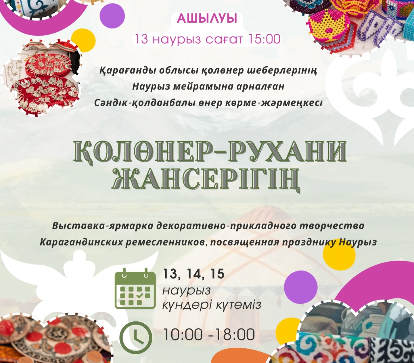 В этом году выставка проходит при поддержке Ассоциации ремесленников Карагандинской области JADIGER. Она будет работать три дня — 13, 14 и 15 марта с 10:00 до 18:00.