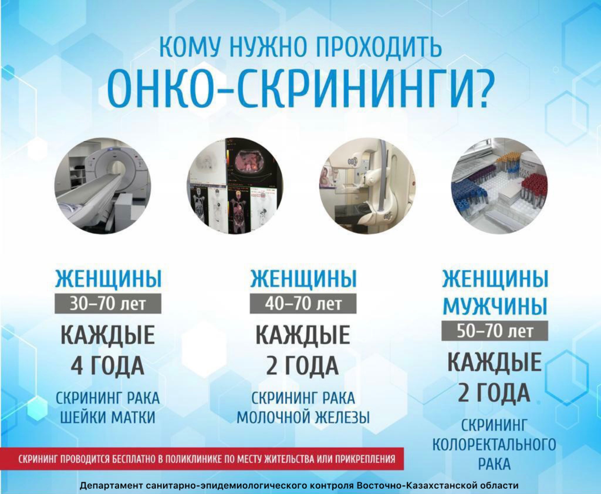Онкоскрининг осуществляется на основании приказа Министра здравоохранения РК от 30 октября 2020 года № ҚР ДСМ-174/2020 «Об утверждении целевых групп, подлежащих скрининговым исследованиям, а также правил, объема и периодичности проведения данных исследований». Скрининговые исследования проводятся среди целевых групп лиц, подлежащих скрининговым исследованиям согласно приложению 1 данного приказа.