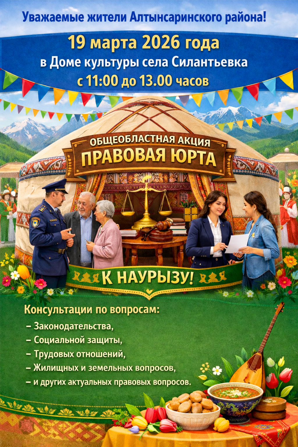 Уважаемые жители Алтынсаринского района! 19 марта 2026 года в Доме культуры села Силантьевка в период с 11.00 по 13.00 часов пройдёт общеобластная акция “Правовая юрта”, приуроченная к празднованию Наурыза. Вы сможете получить разъяснения по вопросам законодательства, социальной защиты, трудовых отношений, жилищных, земельных вопросов, а также иным актуальным правовым вопросам.