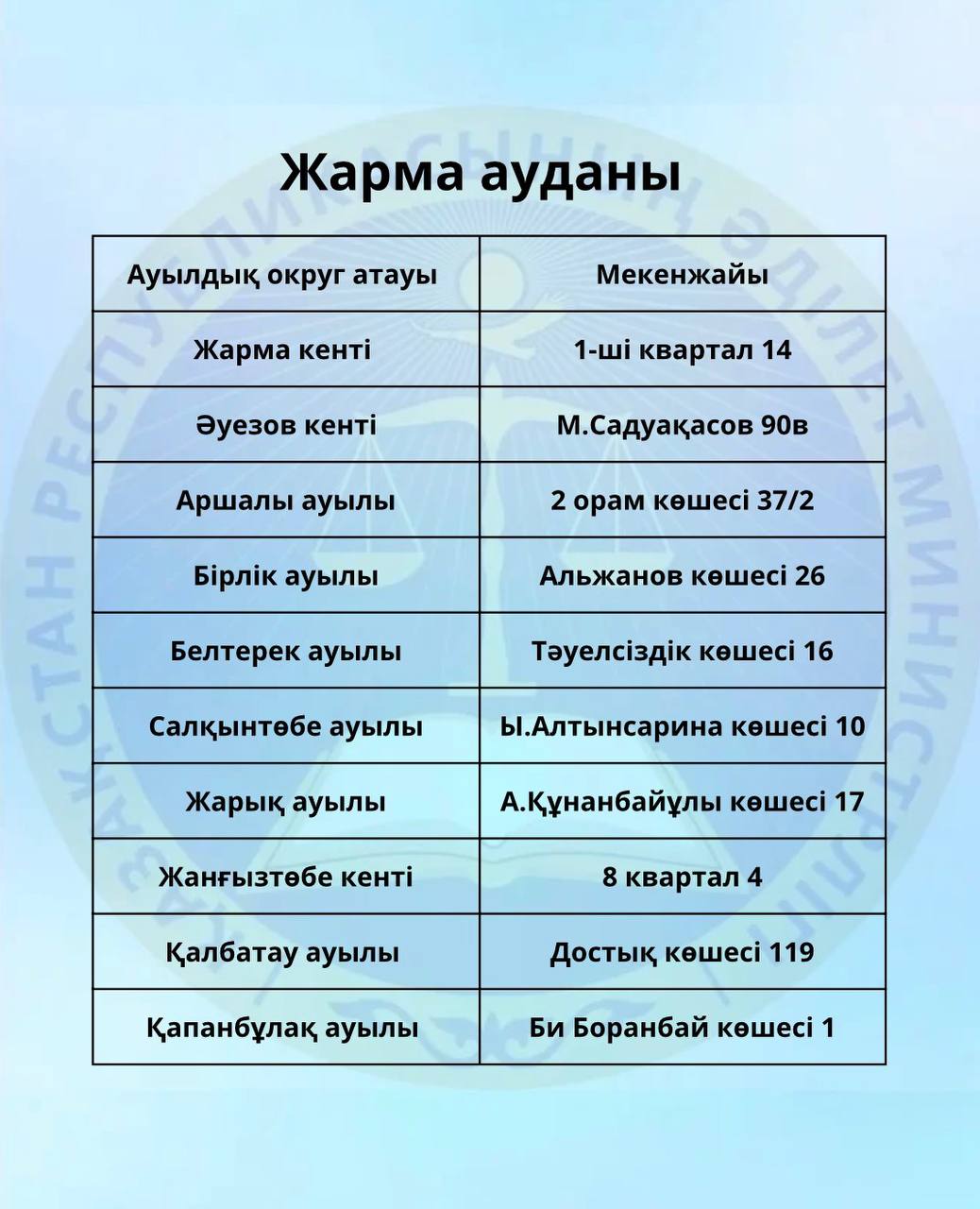 Адреса «Кабинетов права», запущенных в сельских наседенных пунктах на территории области Абай.