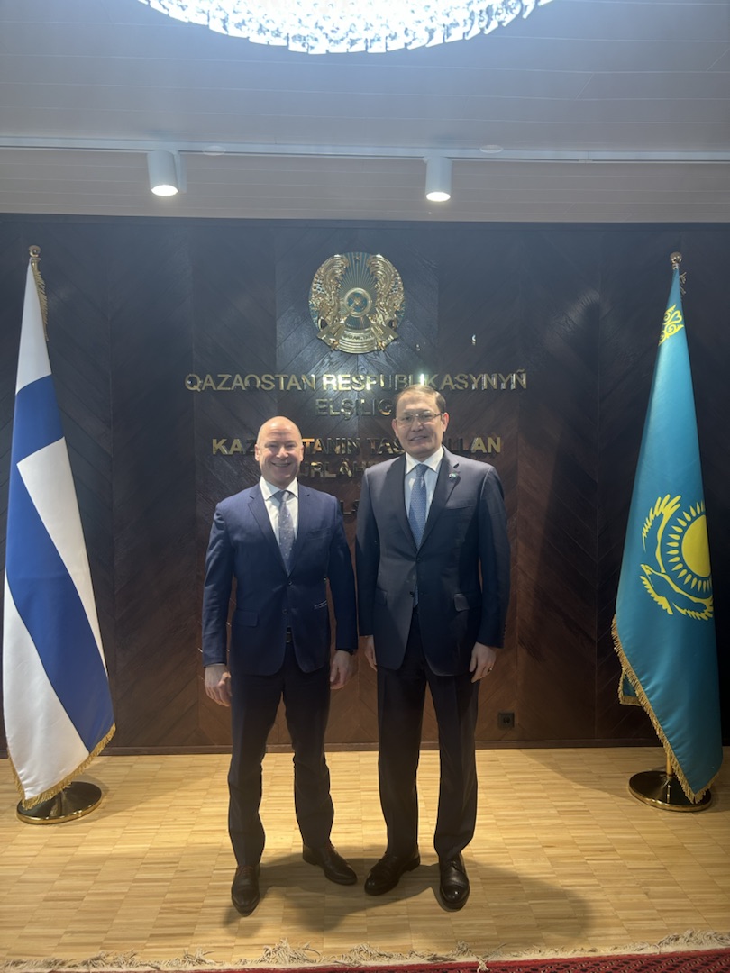 Хельсинки, 11 марта 2026 года – Посол Казахстана в Финляндии Азамат Абдраимов провёл встречу с Генеральным директором Финского института государственного управления «HAUS» Кьёсти Вякевяйненом.