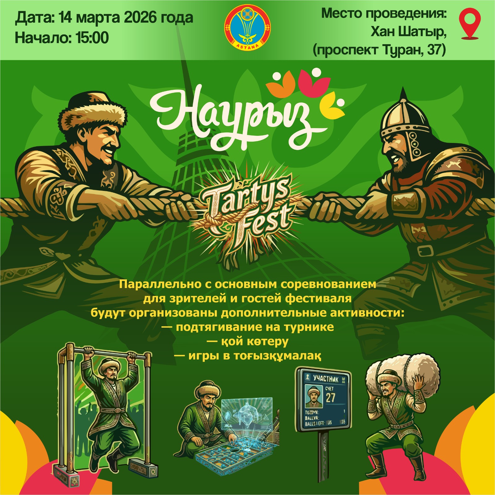 В торгово-развлекательном центре «Хан Шатыр» в Астане пройдет национальный спортивный фестиваль «Tartys Fest». Масштабное мероприятие направлено на популяризацию национальных игр и развитие массового спорта, передает официальный сайт столичного акимата.