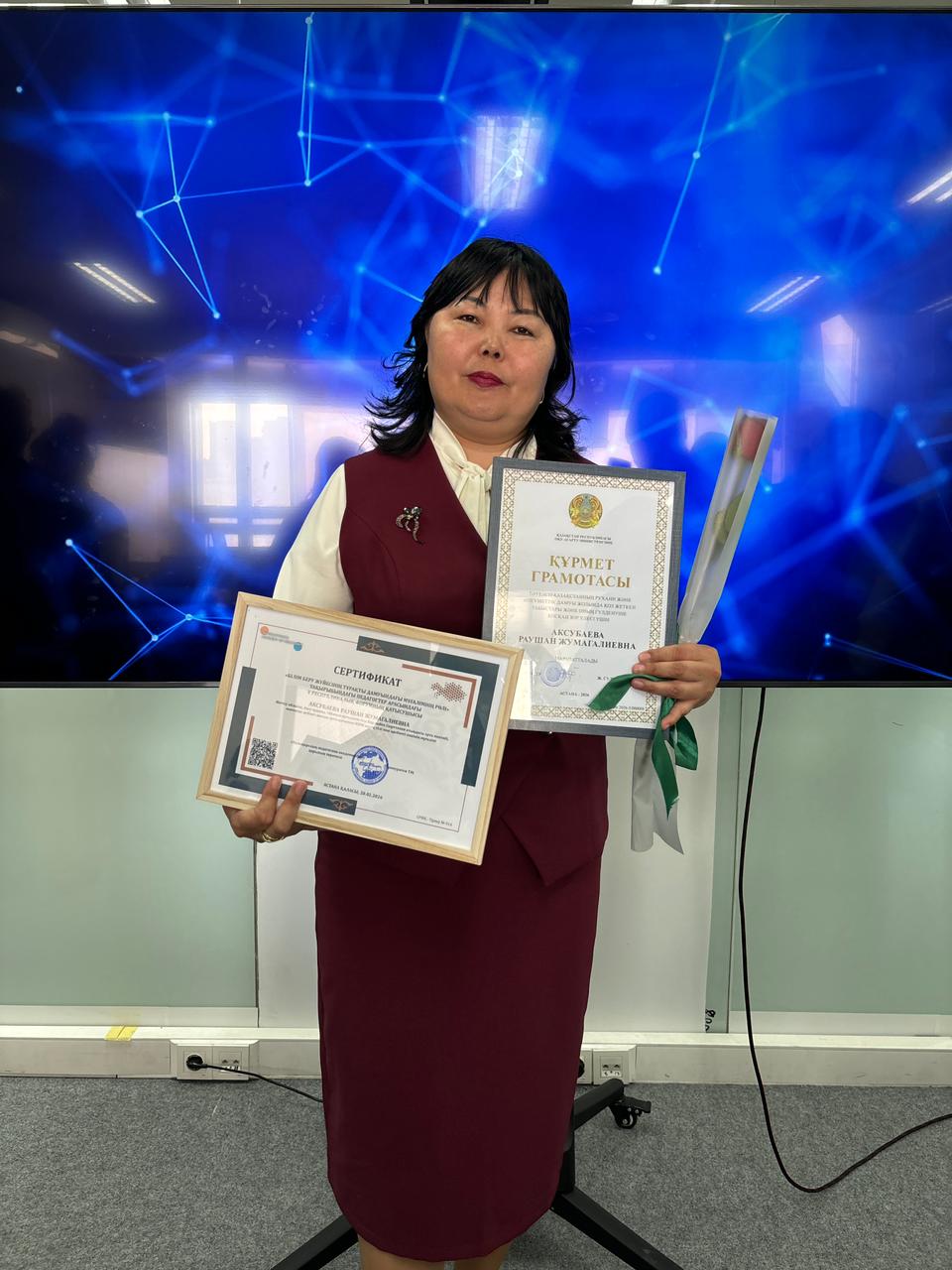 28 февраля в городе Астана на V форуме «Роль учителя в устойчивом развитии системы образования», организованном Международной академией педагогики, учитель казахского языка и литературы средней школы имени Барлыбека Сыртанова Раушан Жумагалиқызы Аксубаева была награждена Почётной грамотой министра просвещения Республики Казахстан Ж. Д. Сулейменовой