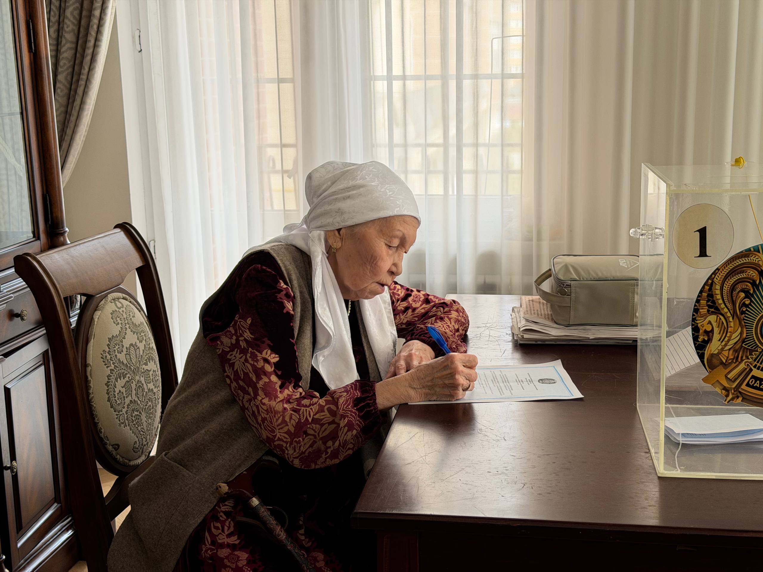 15 марта, заслуженный деятель Казахстана, мастер кюя Сержан Шакират вместе с супругой Розой Сагимбаевой сделал свой выбор посредством переносной урны для голосования на референдумном участке №247.