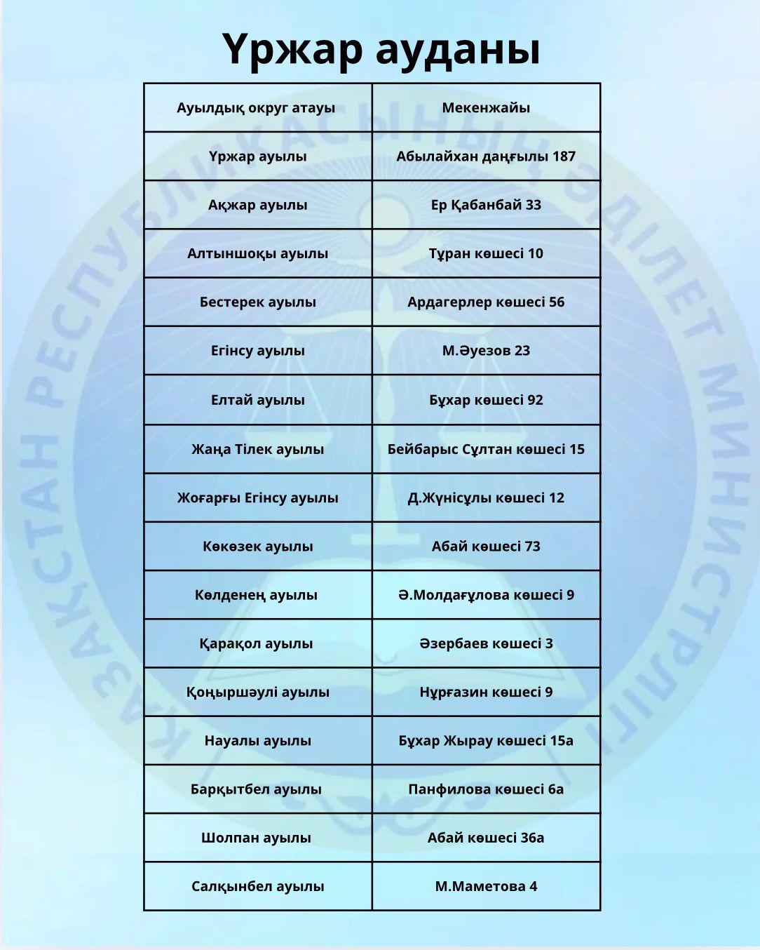 Адреса «Кабинетов права», запущенных в сельских наседенных пунктах на территории области Абай.