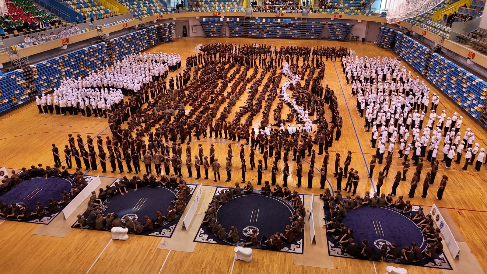 На площадке столичного Дворца единоборств 3000 детей приняли участие во флешмобе «АЛТЫН САҚА»: они выстроились в специальные композиции и изобразили форму асыка «Алшы» и надпись «Алтын сақа».