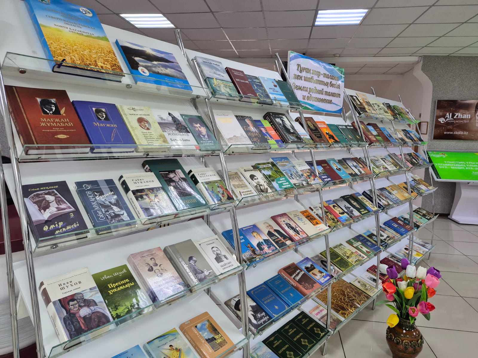 Торжественная атмосфера чувствовалась уже в фойе библиотеки. Гостей встречал фольклорный ансамбль, который радовал пришедших звучанием народных музыкальных инструментов. Также вниманию участников встречи была представлена книжная выставка «Туған жер – талант пен шабыттың бесігі», где находились произведения поэтов и писателей Северо-Казахстанской области.