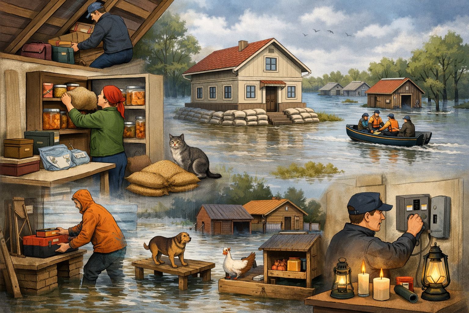 Основные правила поведения при паводках и наводнениях заключаются в следующем: Переместить все ценные вещи и предметы интерьера на возвышенность (чердак, 2 этаж) Освободить чердак от продуктов. Первым делом при затоплении домов вода пойдет вниз. Все важные документы упаковать плотно в непромокаемый материал Укрепить оконные рамы и дверные проемы Со двора занести строительный инвентарь или поднять его над уровнем земли на несколько метров. Крупы плотно закройте и уберите на высокие полки в шкафу. Безопасным местом для сохранения от воды продуктов питания будет холодильник. Заранее подумайте о домашних животных. Лучше соорудить для них убежище повыше от земли. Полностью обесточьте жилище. Приготовьте свечи, фонарь и предметы первой необходимости.