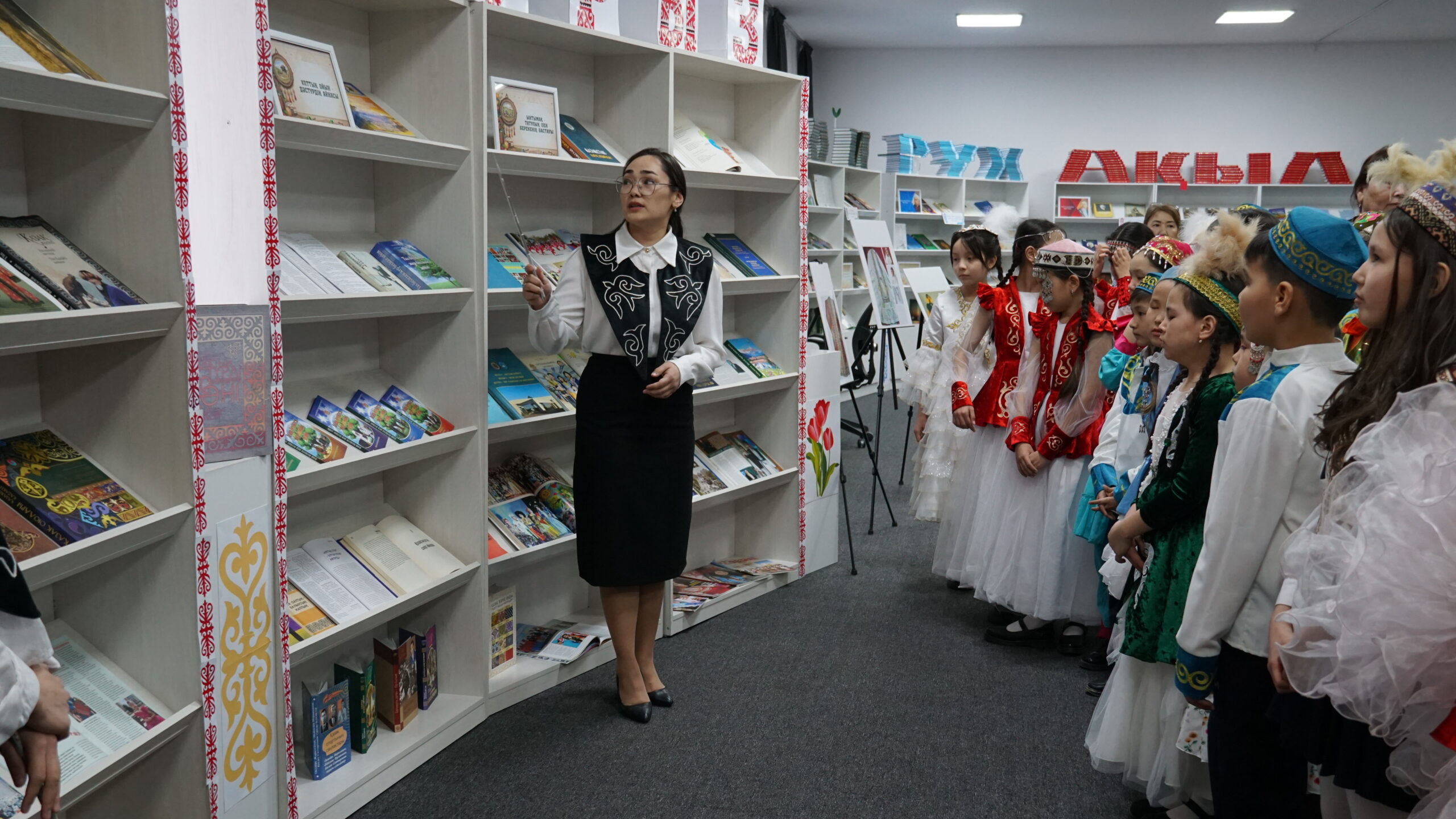 На книжную выставку были приглашены учащиеся 4 класса средней школы №4. В рамках мероприятия учащиеся ознакомислись с историей нацициональной одежды и узнали о богатом наследии казахского народа.