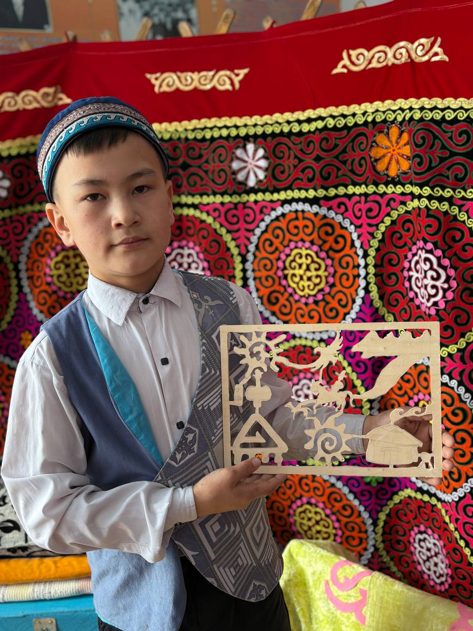 Ермек Абибол, используя фанеру, мастерски вырезал на деревянной поверхности национальные орнаменты и создал содержательную композицию на темы «Великая степь», «Национальное наследие» и «Сокровище нации». Его работа отражает богатую культуру и духовные ценности казахского народа, а также передаёт уважение к родной земле.