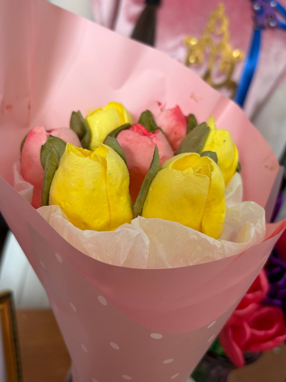 В свою очередь Айдана Байшүкір удивила оригинальной идеей — она изготовила из зефира букет тюльпанов, символизирующих весну. Композиция выглядит как настоящий цветочный букет, передавая нежность, красоту и атмосферу весеннего тепла.