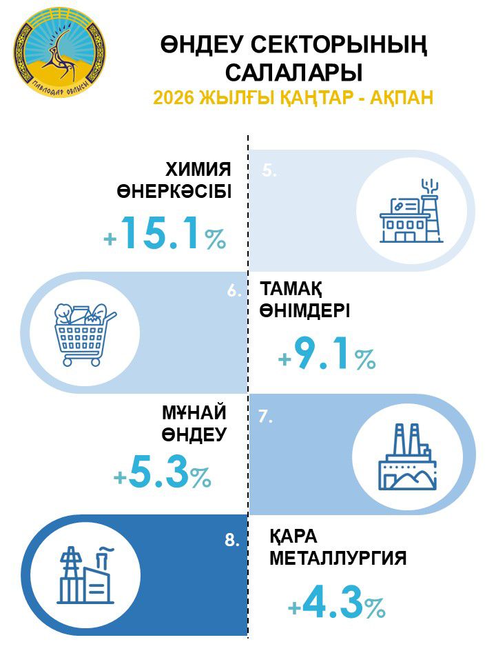 В январе-феврале 2026 года инвестиции в основной капитал выросли на 14,5% к аналогичному периоду прошлого года и составили 85,7 млрд. тенге. В том числе в обрабатывающем секторе инвестиции составили 16,1 млрд. тенге.