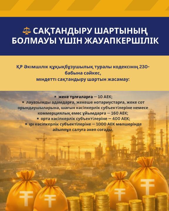 Согласно ст. 230 Кодекса Республики Казахстан об административных правонарушениях, незаключение договора обязательного страхования влечёт штраф: