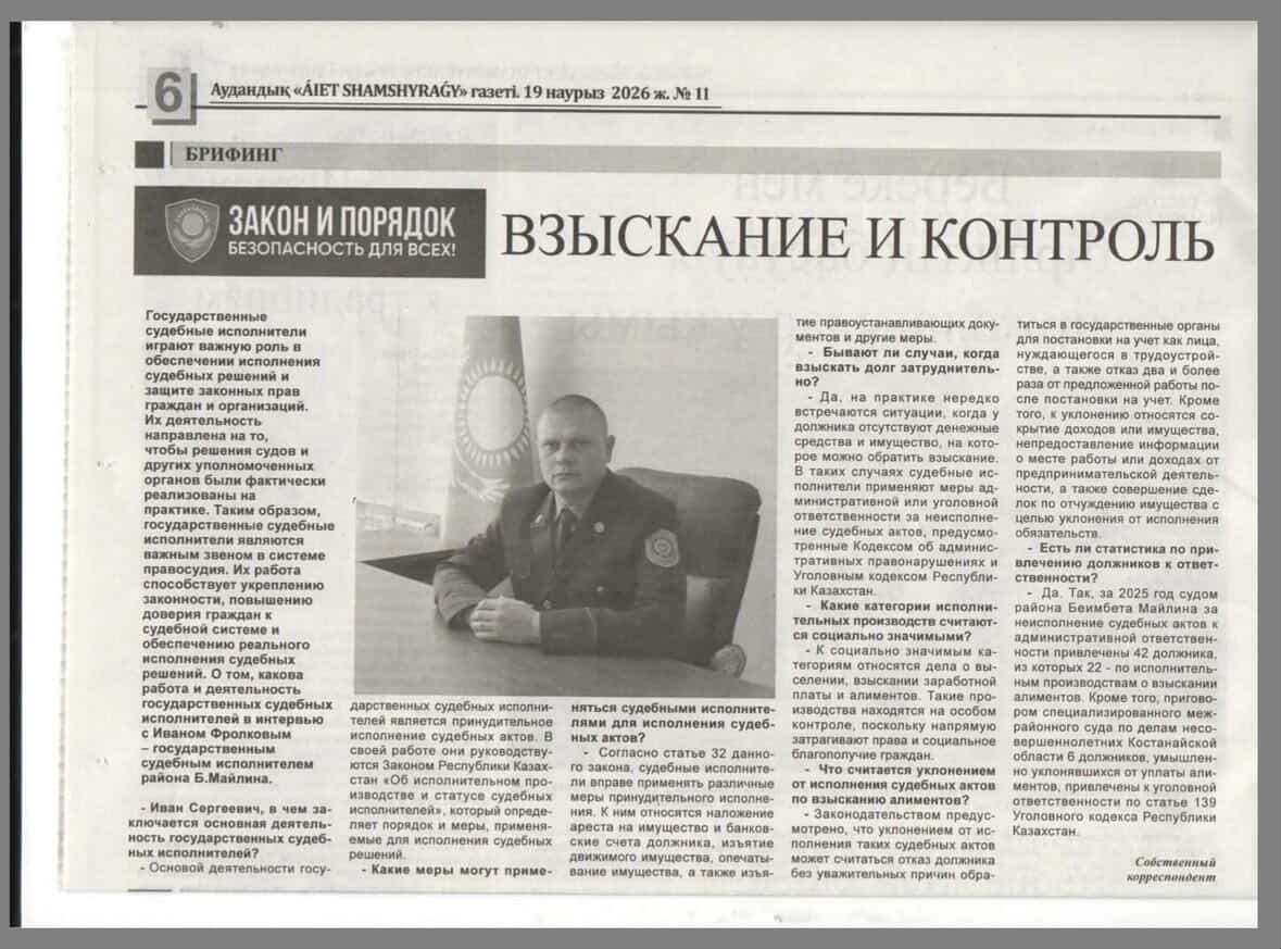 В рамках реализации идеологии «Закон и порядок» 19 марта 2026 года опубликована статья руководителя Межрайонного территориального отдела принудительного исполнения Беимбета Майлина Ивана Фролкова.