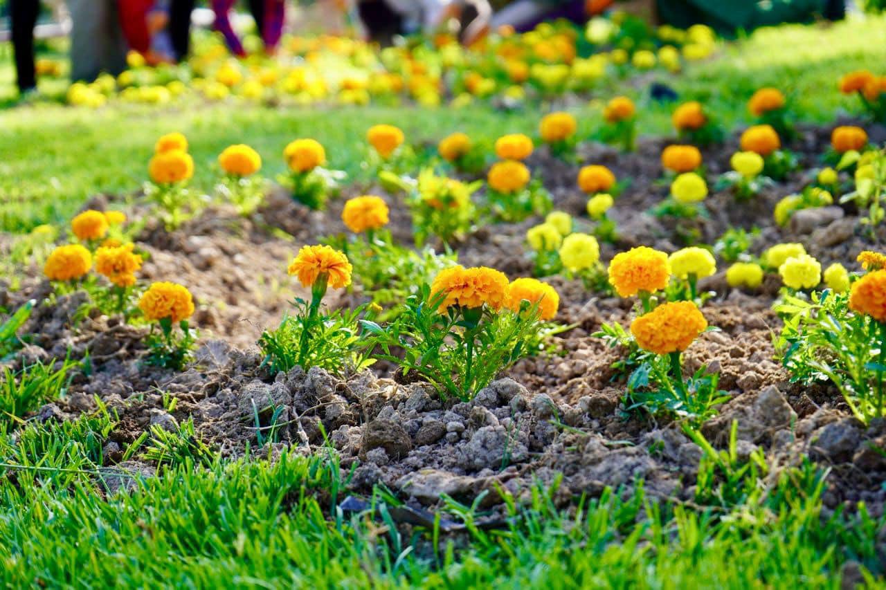 Среди высаживаемых растений — разнообразные виды петунии, шафран, тагетес, сальвия, а также бонанза и серебристая цинерария. Эти цветы не только выполняют декоративную функцию, но и способствуют улучшению экологической обстановки и качеству воздуха.