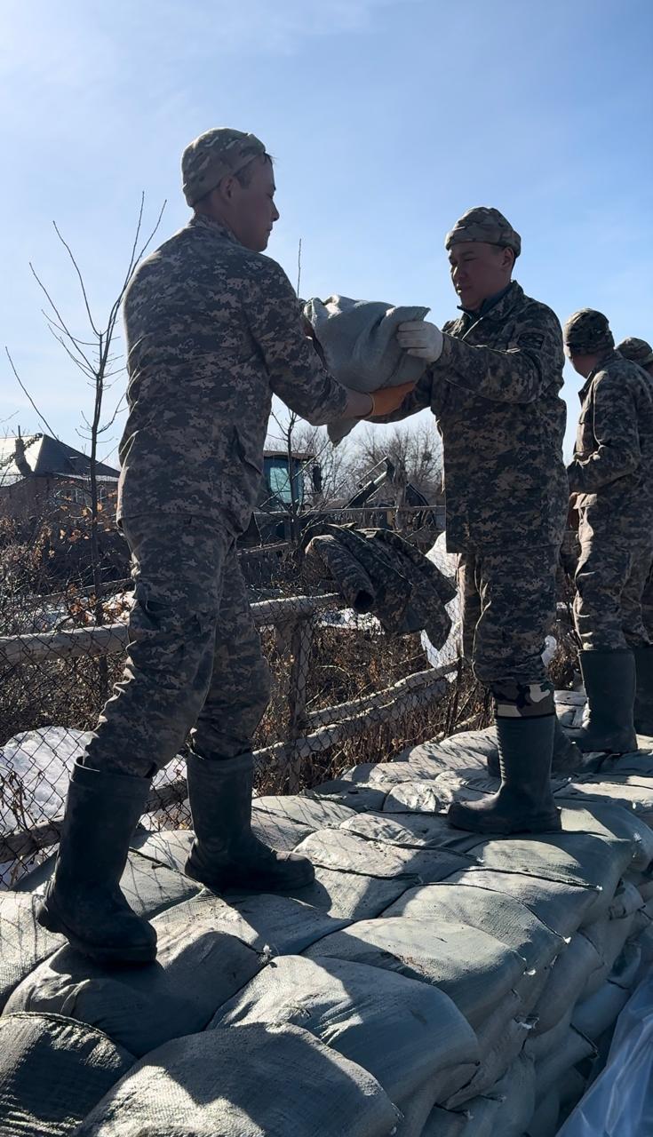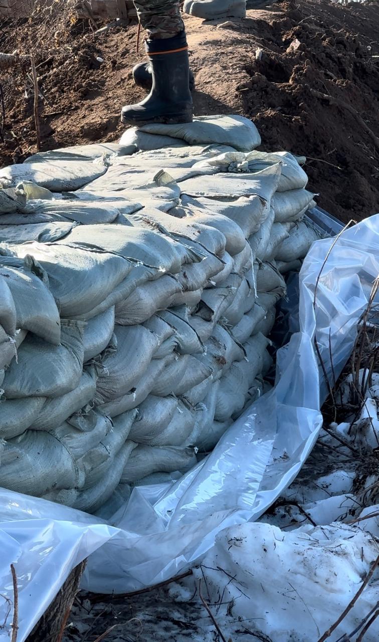 В селе Курское военнослужащие территориальной обороны войсковой части 99265 проводят работы по укладке мешкотары с целью недопущения поступления воды в жилой сектор.