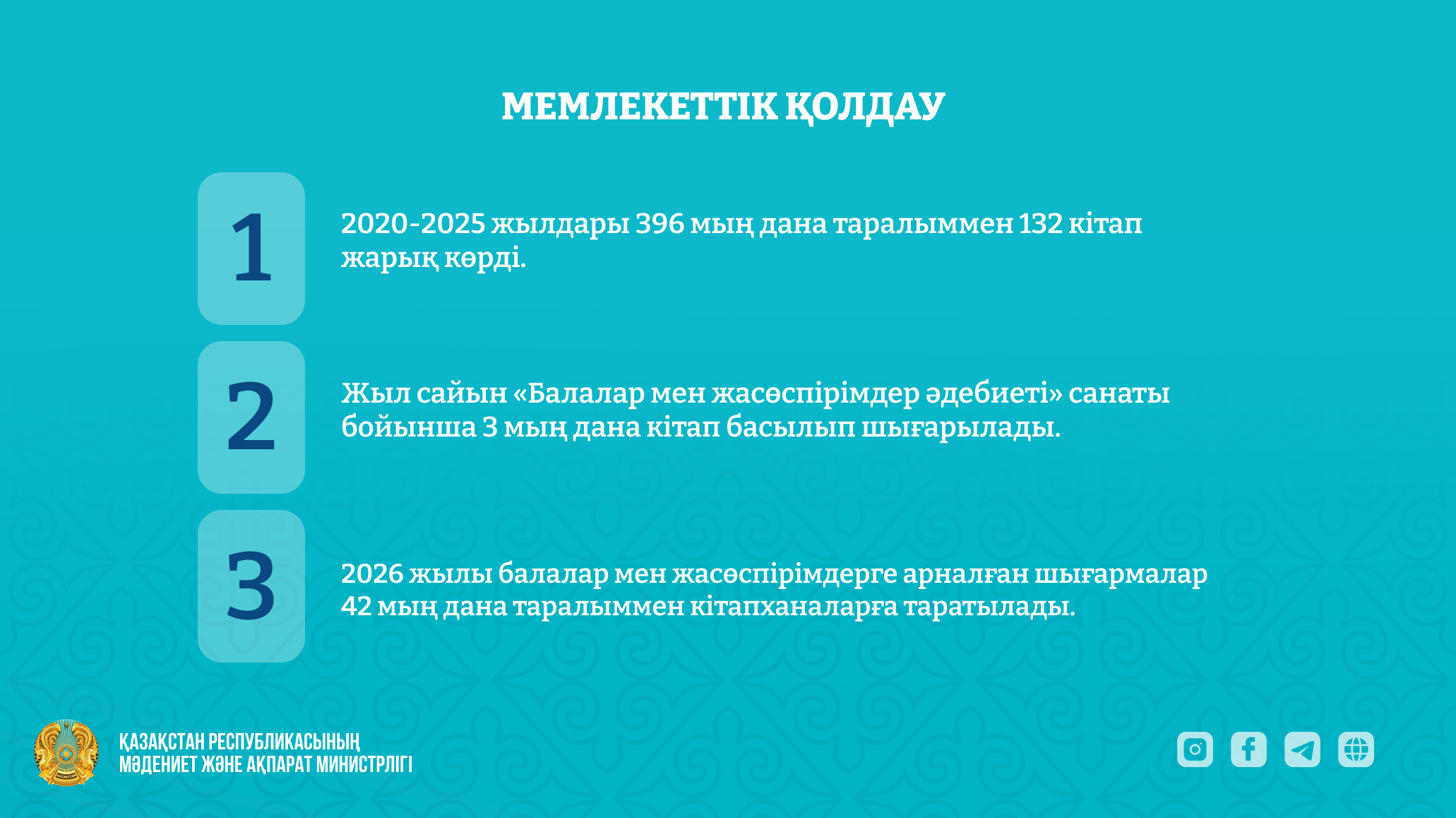 В 2026 году планируется издать и направить в библиотеки 42 тысячи экземпляров книг для детей и подростков. Для повышения доступности литературы электронные версии размещаются на портале Казахстанской национальной электронной библиотеки.