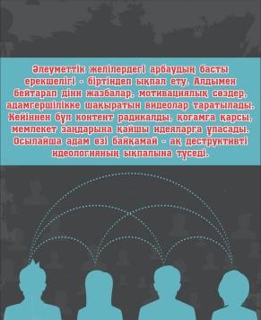 Экстремистік және террористік ұйымдардың халыққа ақпараттық әсер ету құралдарын кеңінен пайдалануы олардың қызметінің ажырамас бөлігіне айналды. Бұл ұйымдар ең алдымен желі қолданушыларының әлі қалыптаспаған санасына әсер етуге бағытталған. Яғни, олардың негізгі мақсаты — әлеуметтік жағдайы мен дүниетанымы әлі толығымен қалыптаспаған топтар. Азаматтардың діни сауаты төмен адамдардың діни ақпаратты интернеттен іздейтіні белгілі. Сол үшін діни ақпаратты әлеуметтік желіден алмас бұрын жан-жақты сүзгіден өткізу қажет.