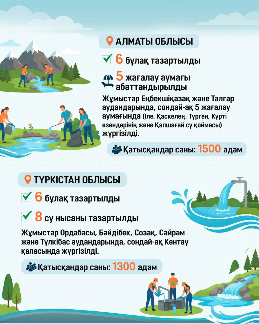 В рамках Президентской инициативы «Таза Қазақстан» Министерство водных ресурсов и ирригации запустило экологическую акцию «Мөлдір бұлақ» по очистке родников по всей территории Казахстана.