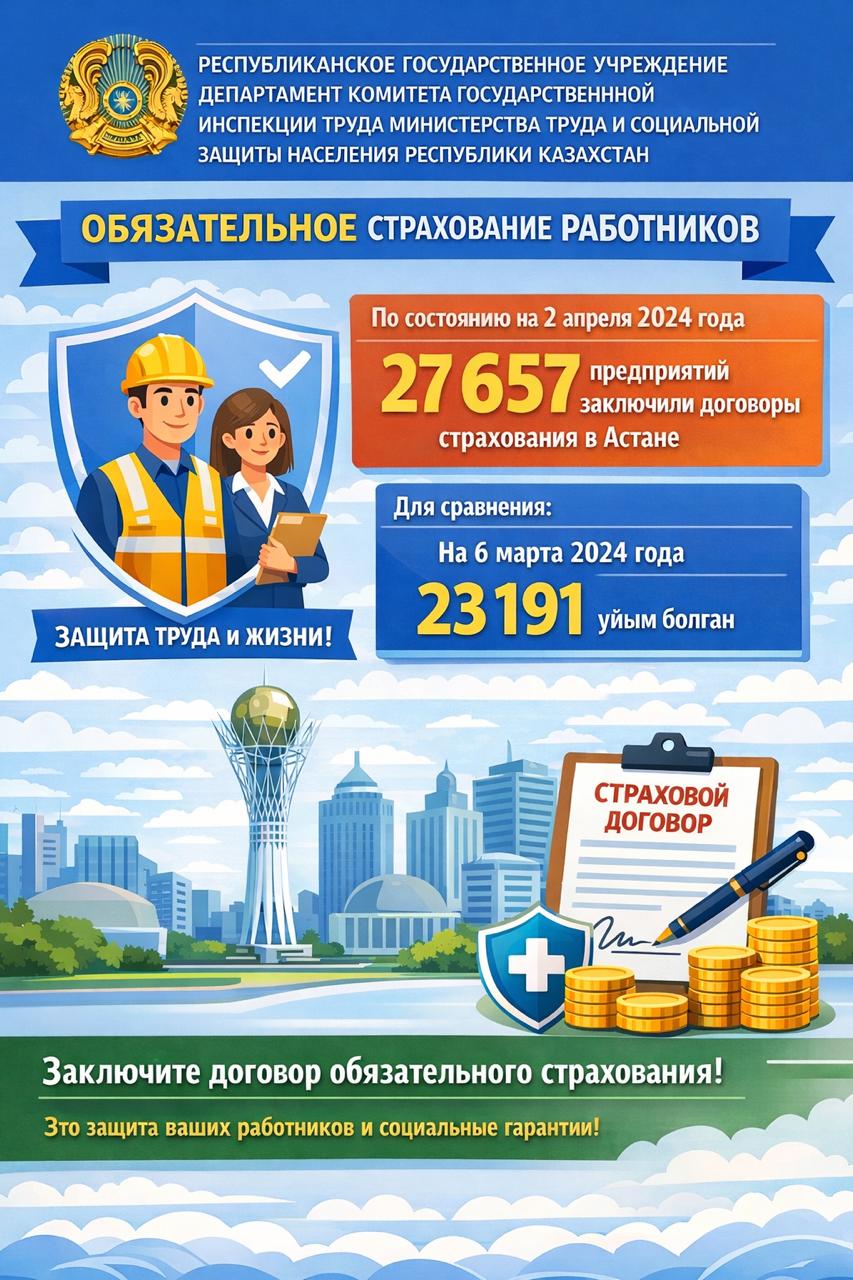В целях повышения уровня охвата предприятий обязательным страхованием работников Комитетом государственной инспекции труда Министерства труда и социальной защиты населения Республики Казахстан утверждён план мероприятий на 2026 год.