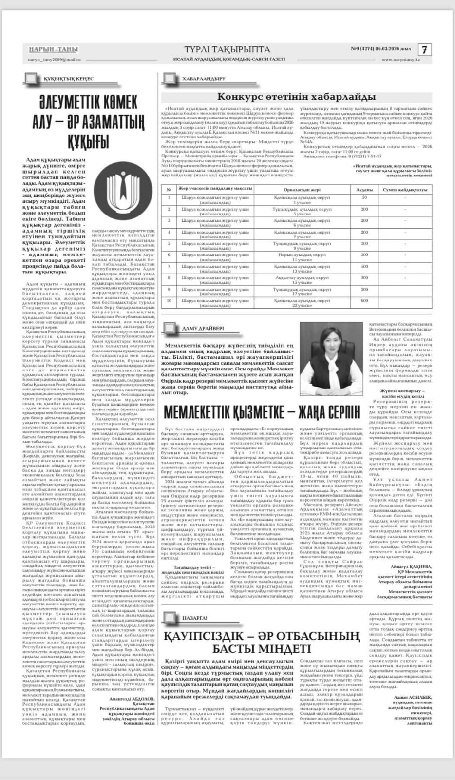 На страницах Исатайской районной общественно-политической газеты в рубрике “Құқықтық кеңес” опубликована статья представителя Уполномоченного по правам человека по Атырауской области А.Абдолова о правах граждан на социальную помощь.